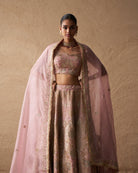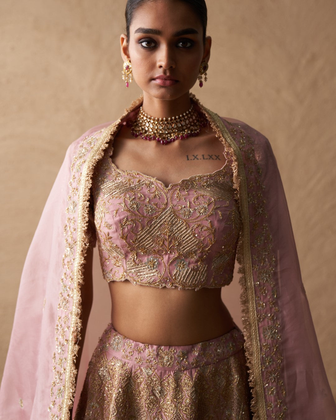 This enthralling lehenga has captivating sitara work along with bugle beads to give it a dash of shimmer. A perfect pick for any occasion. It is paired with organza dupatta with delicate motifs all over.