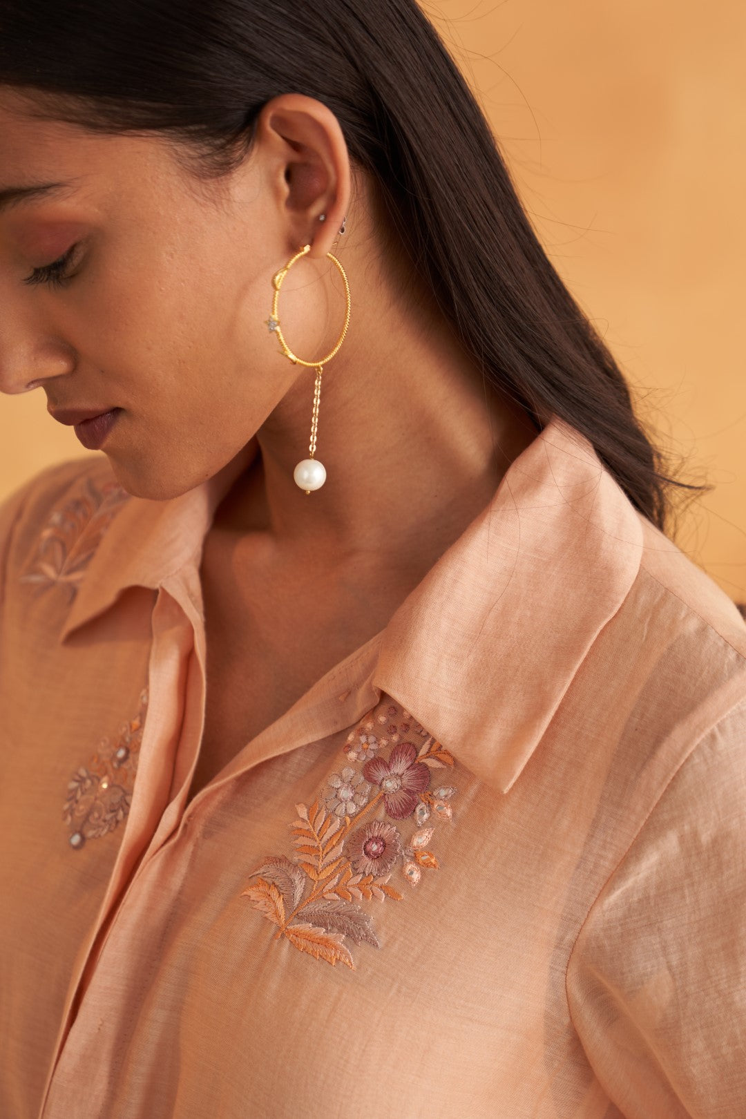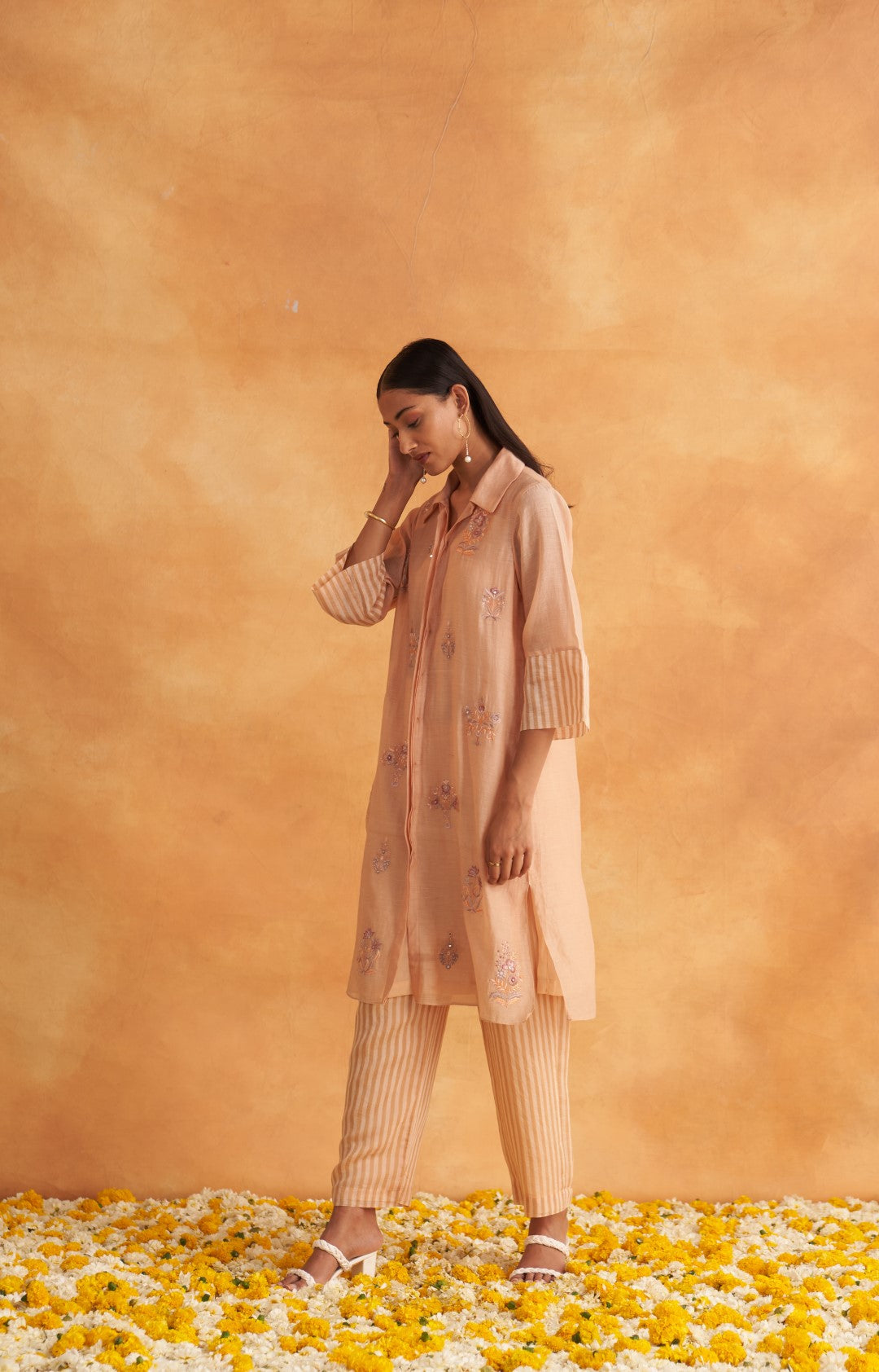 Full casual chanderi Co-ord set comprises of a collared embroidered Enclosed jacket paired with a crape slip and a striped unadorned bottom. The lightness of the fabric and the comfortable fit of the ensemble makes it the perfect sheek outfit for daily wear.