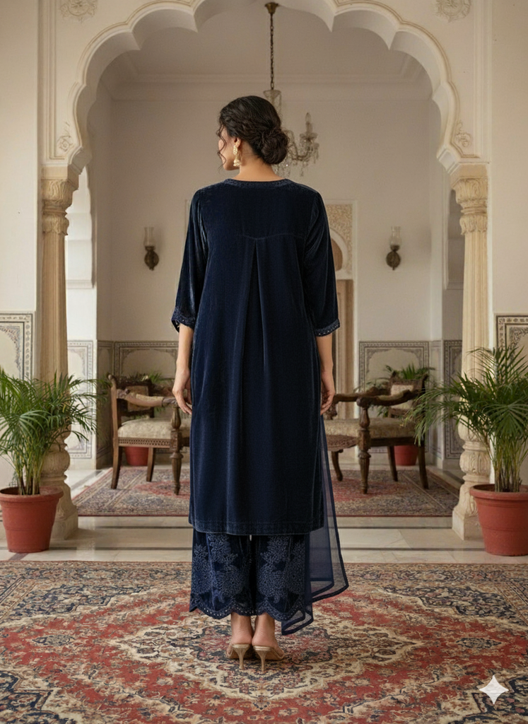 Crafted in lush blue velvet with fine thread embroidery, this suit captures the spirit of heritage luxury—majestic, graceful, and eternally classic.
