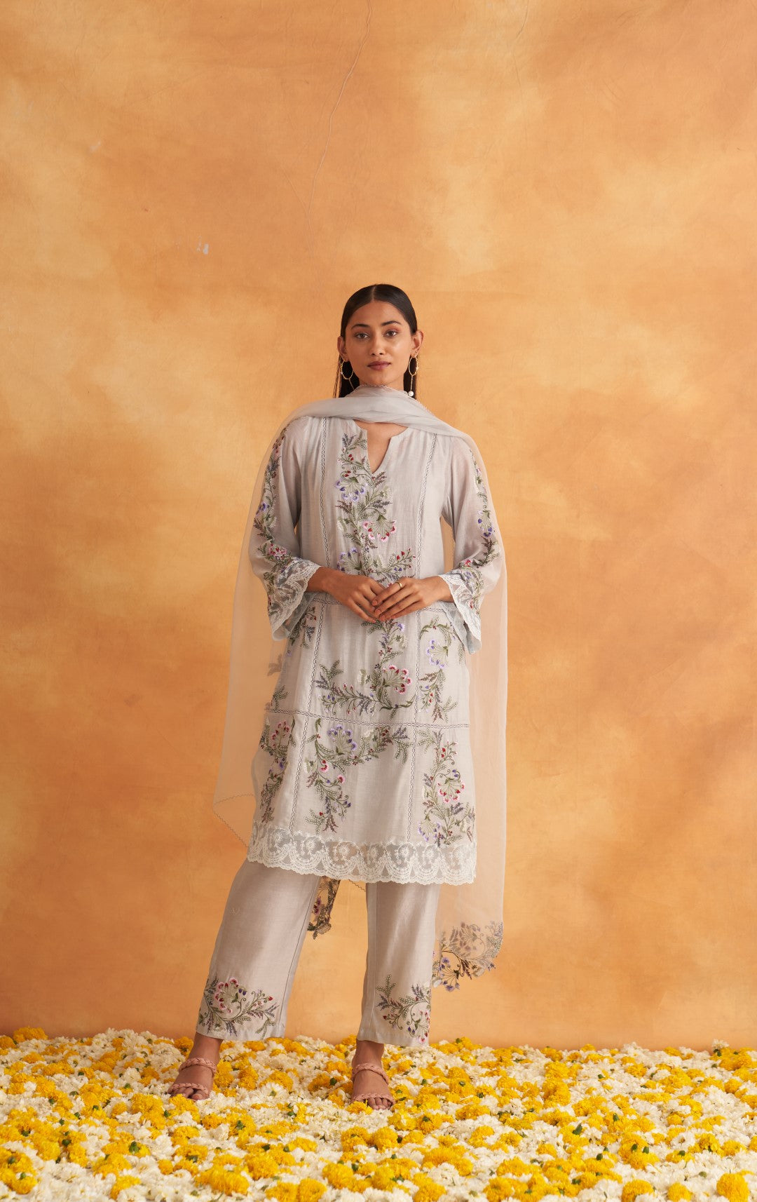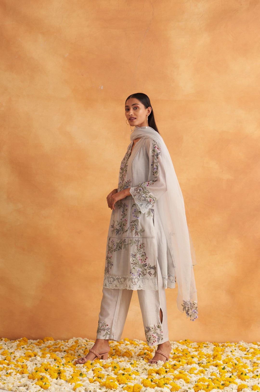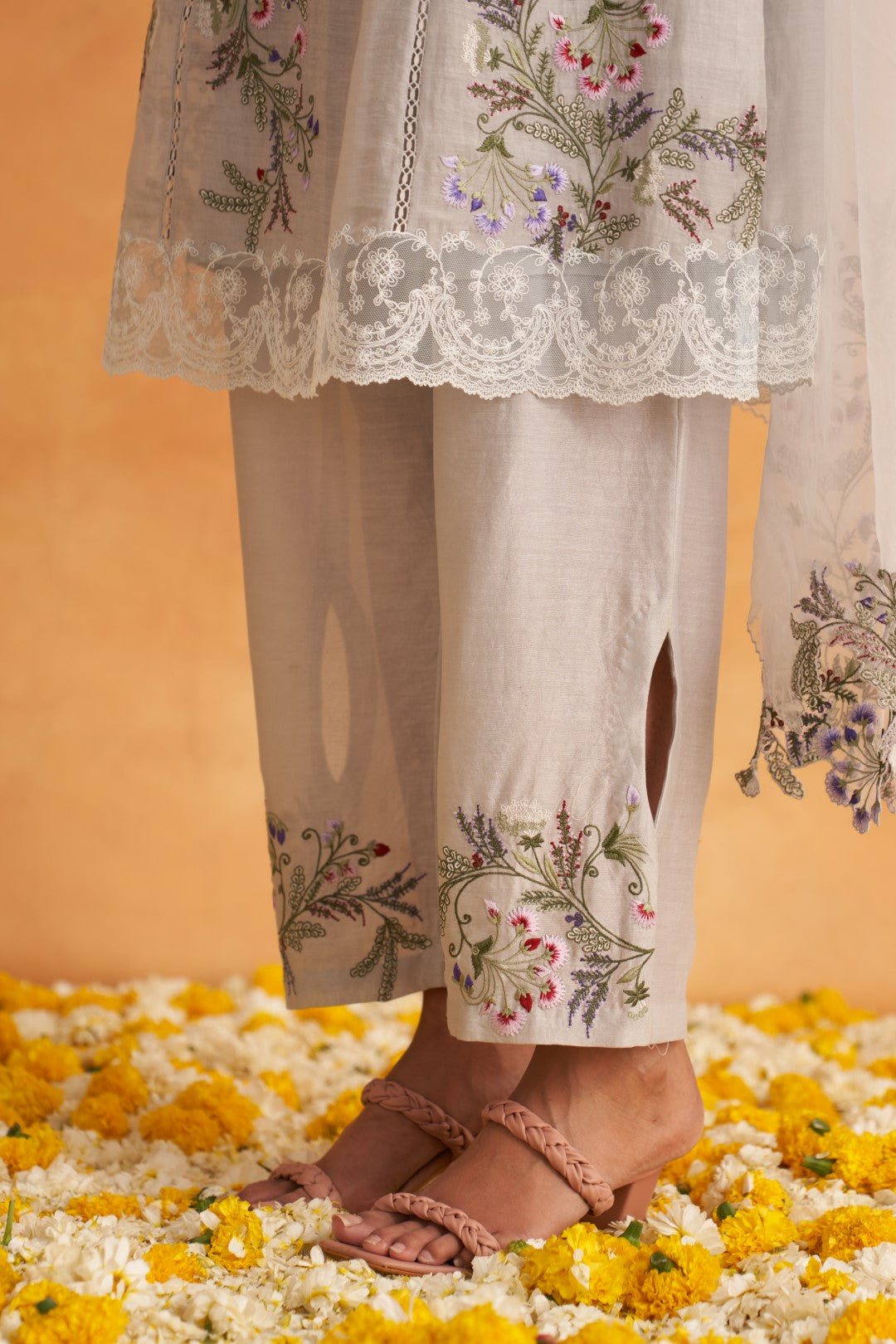 Full Chanderi formal suit set comprises of an embroidered long shirt paired with an embroidered bottom and an organza dupatta. The bottom has stylized keyhole cuts at the seams whereas the shirt has heavier embroidery and lace attachments. The shirt of the ensemble is available with a cotton slip.