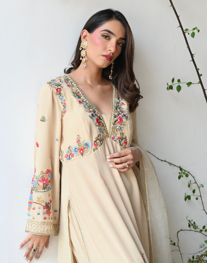 This ivory suit blends timeless elegance with vibrant artistry. Crafted from luxurious georgette fabric, it features intricate embroidered motifs in rich, colorful threads. Perfectly tailored, it offers a modern yet traditional look, ideal for festive occasions or elegant evenings.