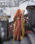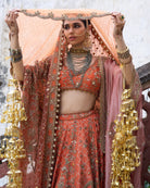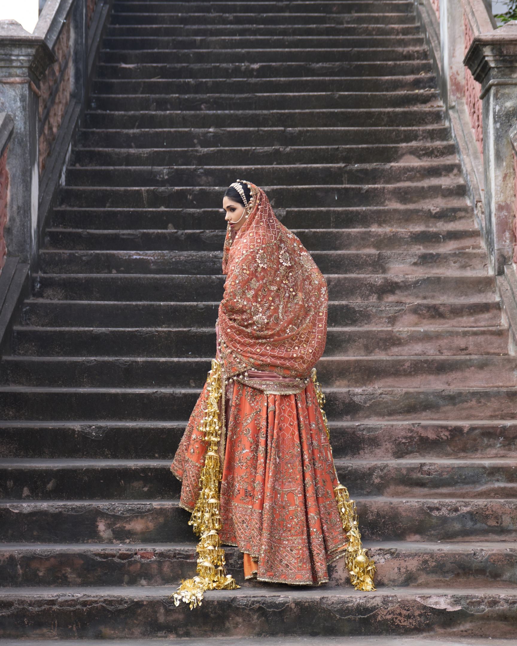 Jugni is a striking orange bridal lehenga that embodies the spirited soul of Punjab. Designed with a dramatic trail, it flows with regal elegance, while handcrafted ghungroo embellishments add rhythm and life to every step. The vibrant hue symbolizes celebration and strength, making this lehenga a powerful blend of tradition, movement, and bridal grandeu