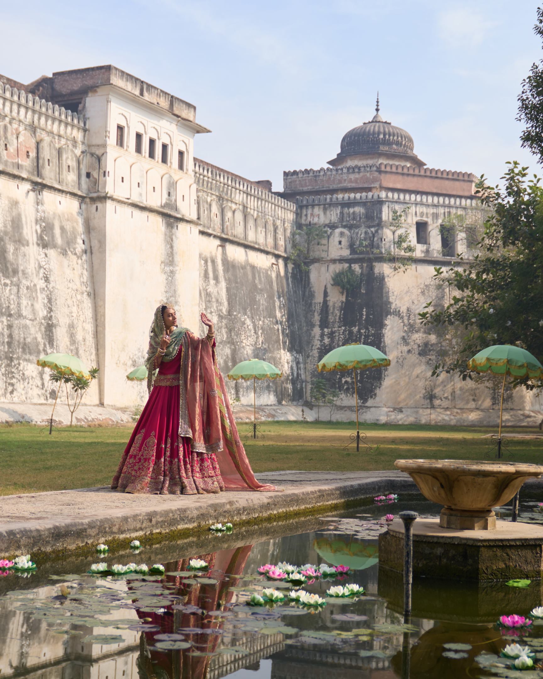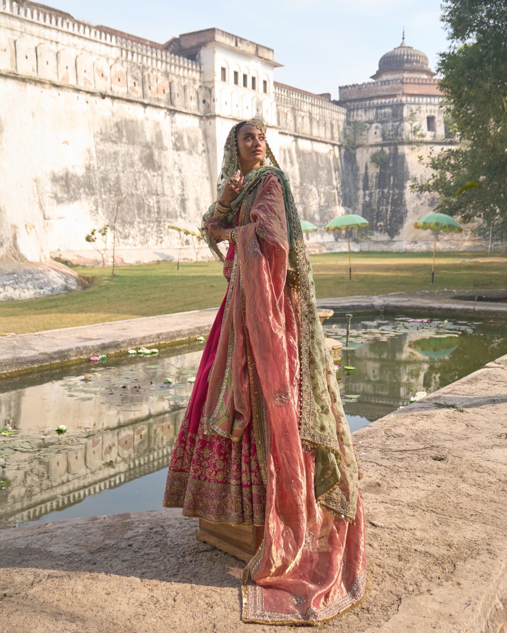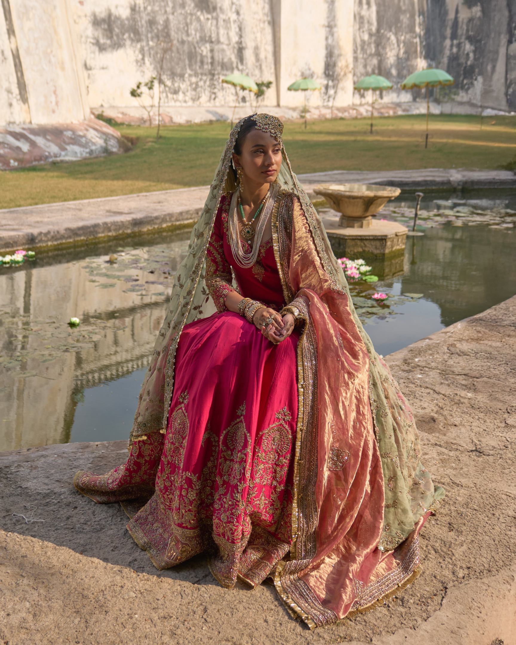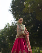 A majestic fuchsia bridal lehenga crafted with 50 flowing kalis, creating a grand, regal silhouette worthy of a Maharani. Rich in color and opulence, it is adorned with exquisite hand embroidery inspired by royal courts, celebrating heritage craftsmanship and timeless bridal splendor. Designed to command presence, this lehenga embodies power, grace, and queenly elegance.
