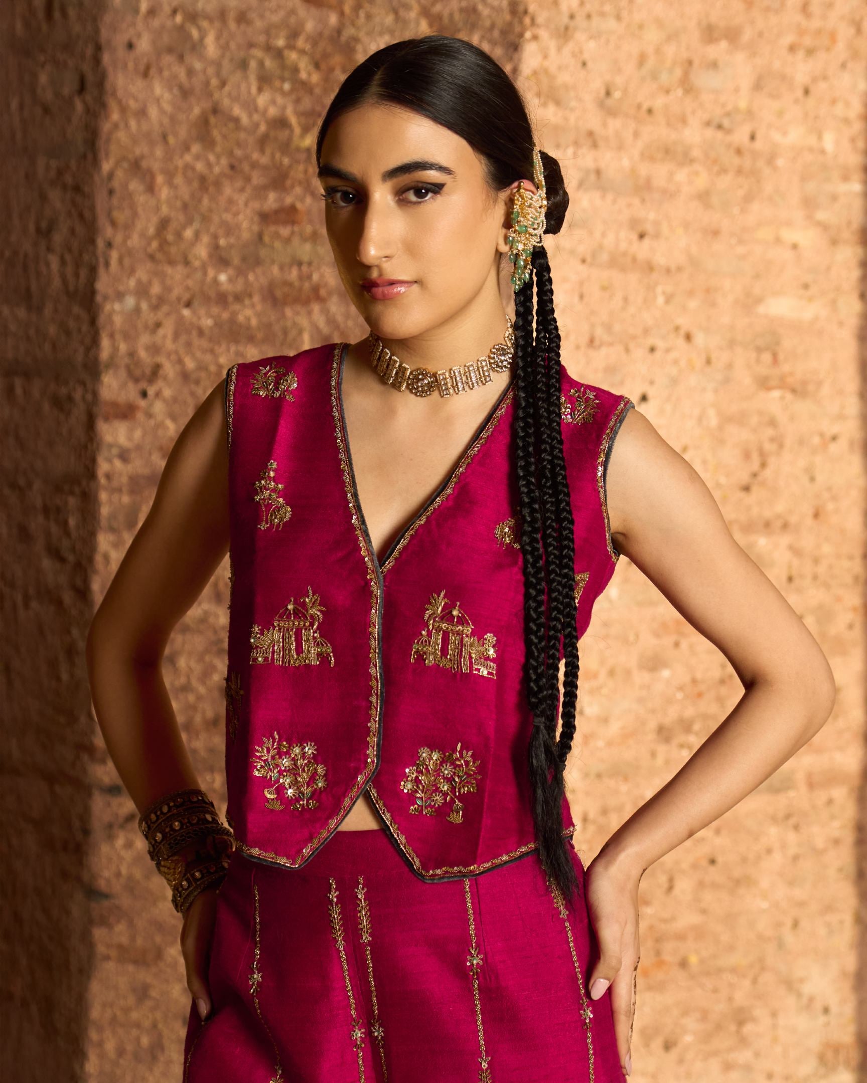 A vibrant magenta corset ensemble that fuses royal elegance with contemporary structure. The fitted corset bodice is meticulously hand-embroidered, showcasing intricate motifs that reflect timeless craftsmanship.