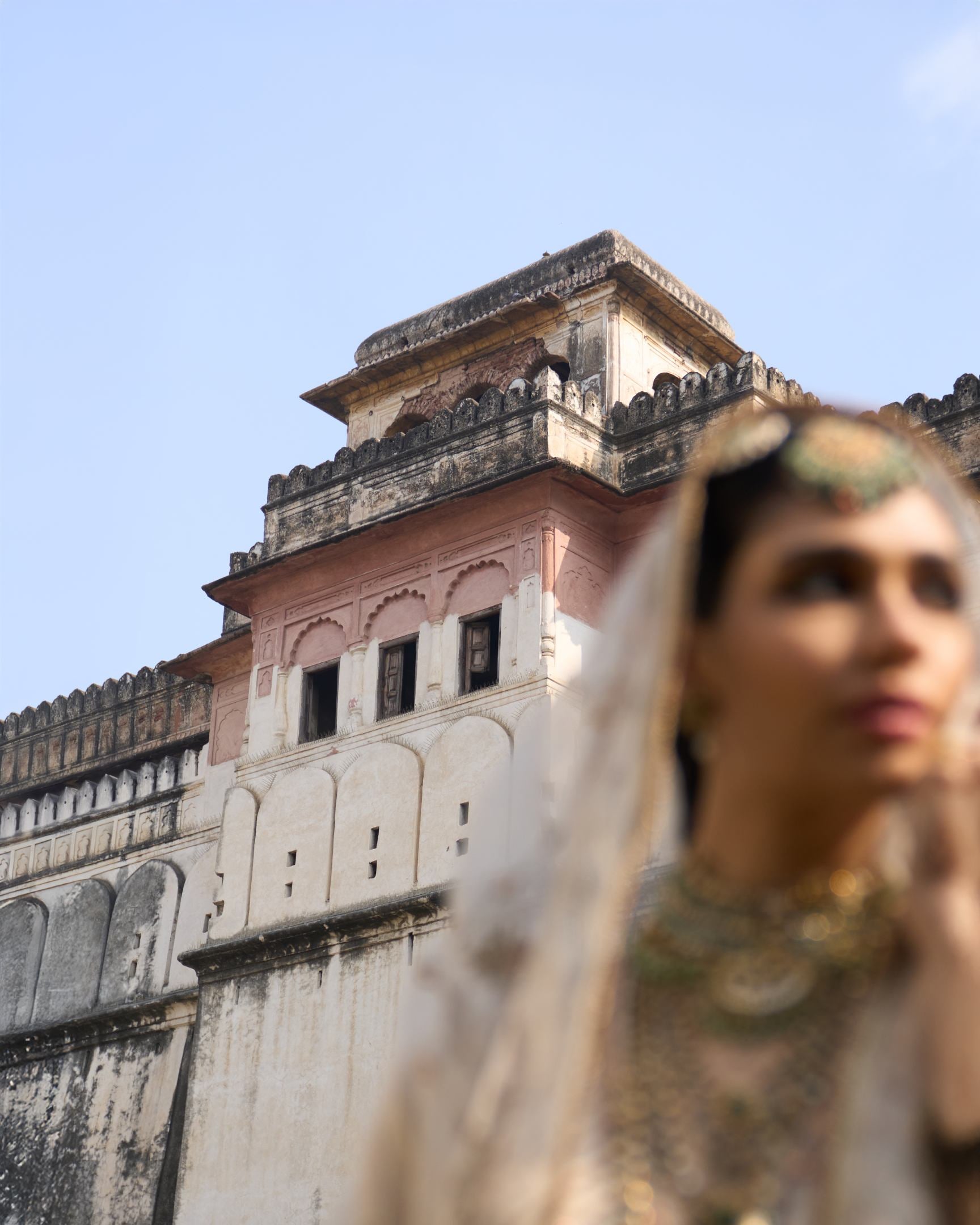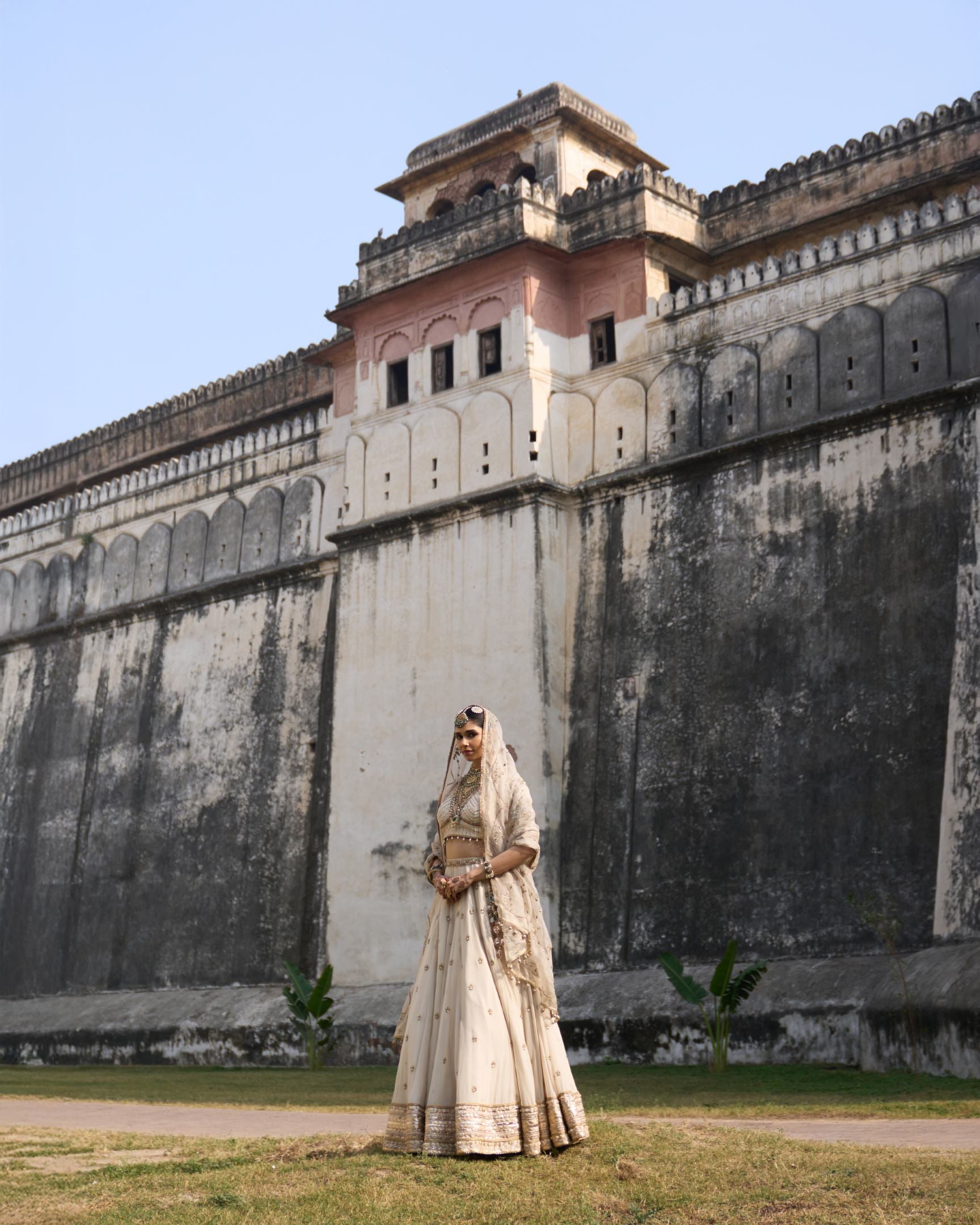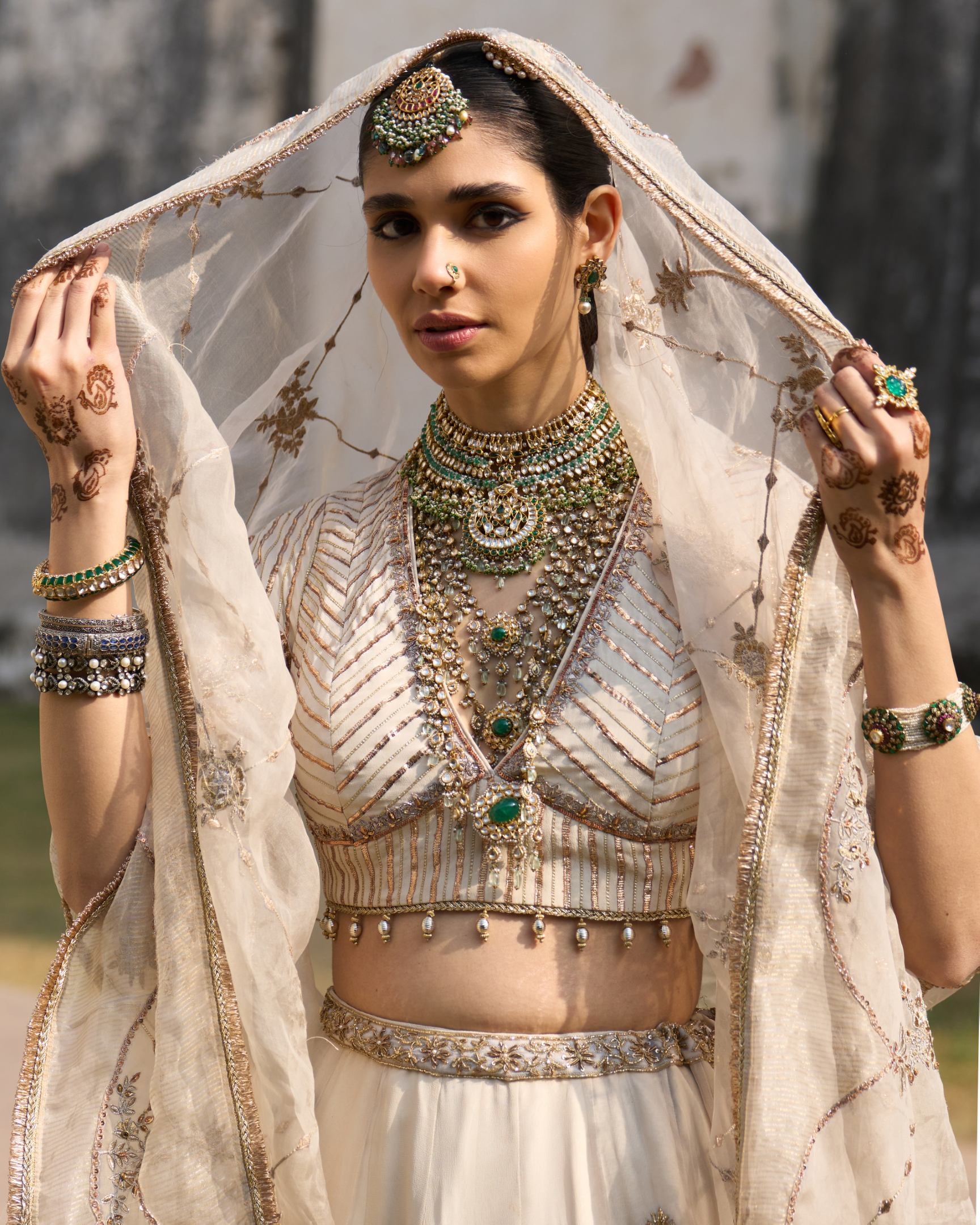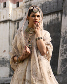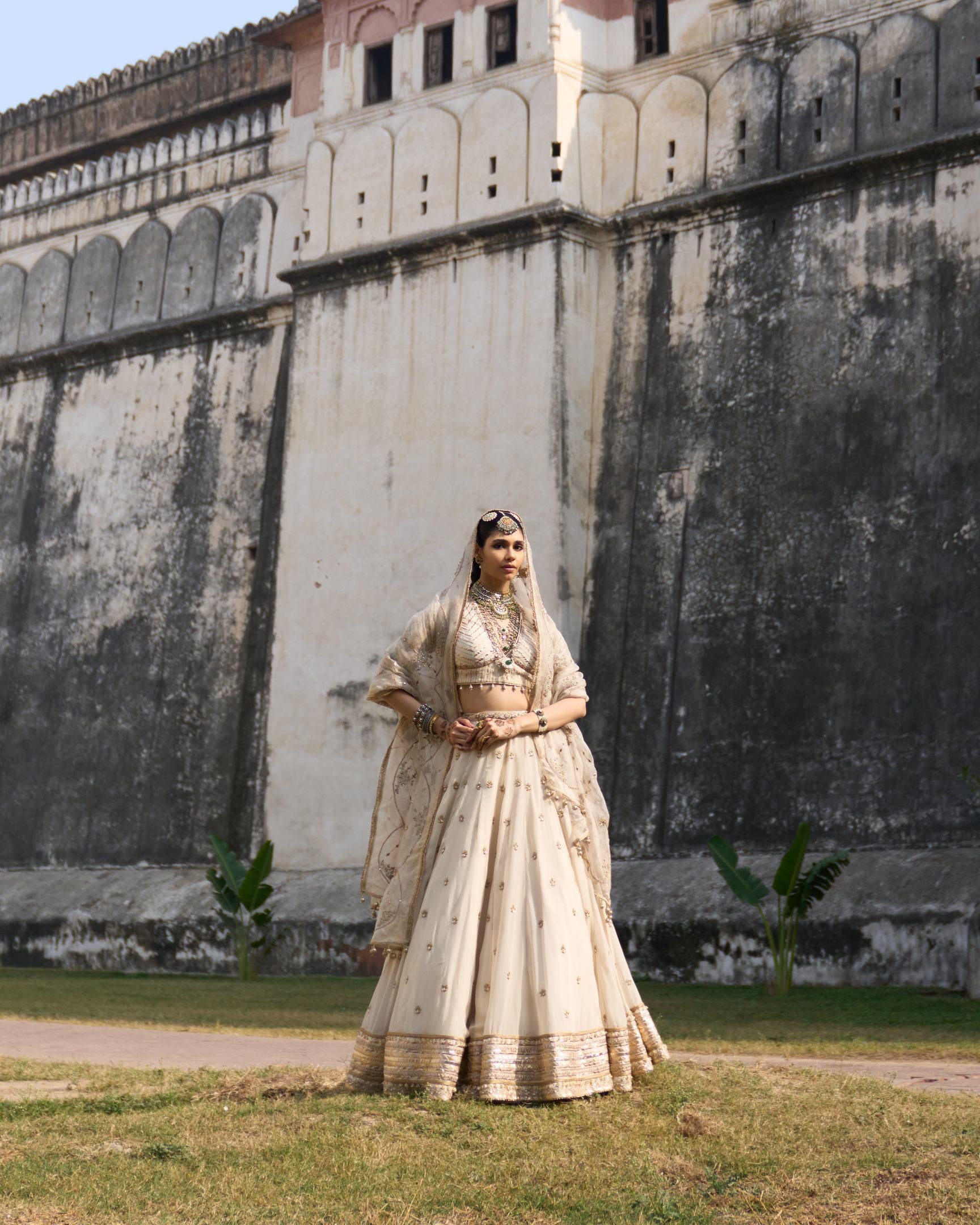 An elegant ivory lehenga adorned with intricate gota work, reflecting the beauty of timeless Indian craftsmanship. The delicate shimmer of hand-applied gota highlights the soft ivory base, creating a look that is graceful, festive, and effortlessly refined. Perfect for celebrations where understated luxury speaks volumes.