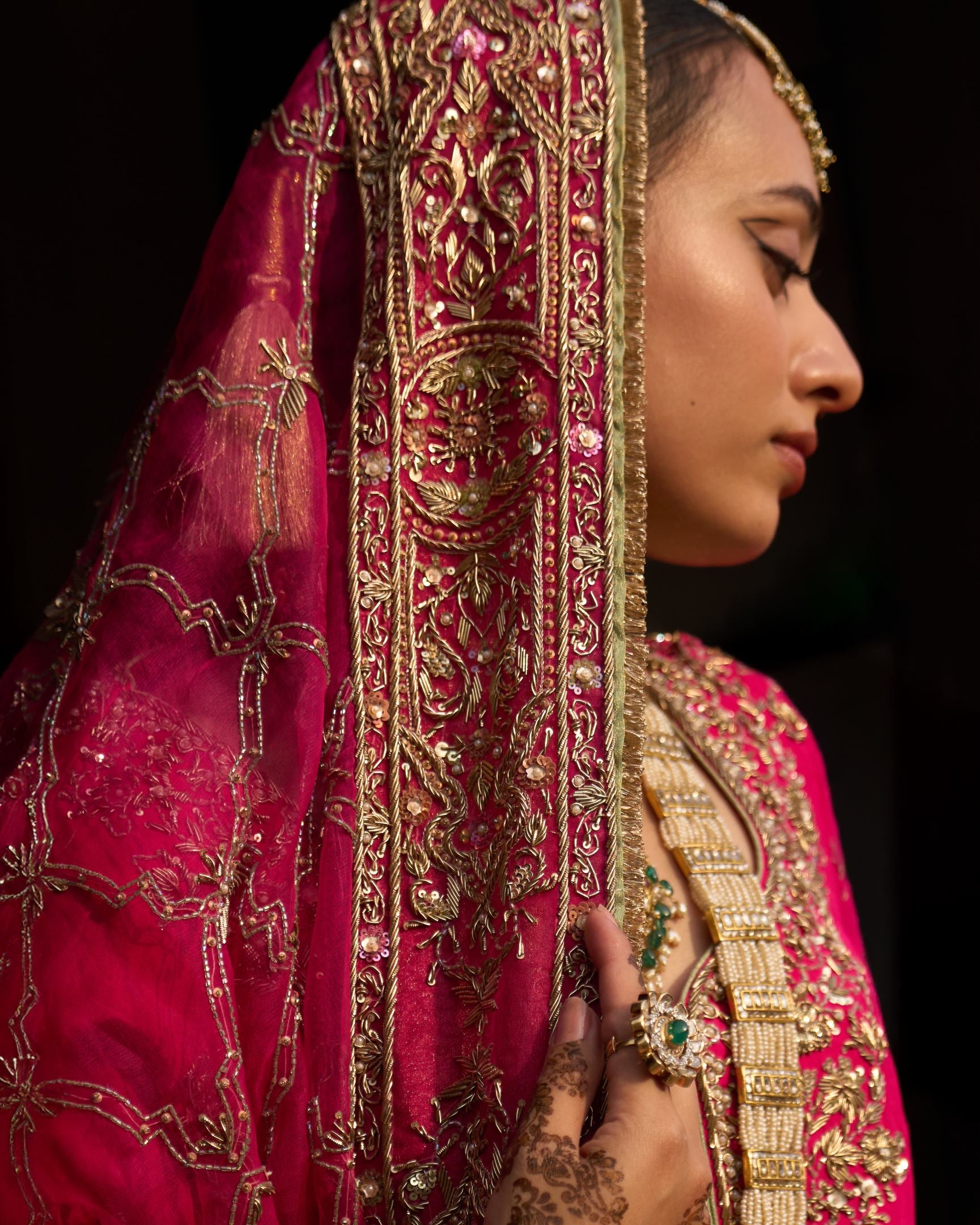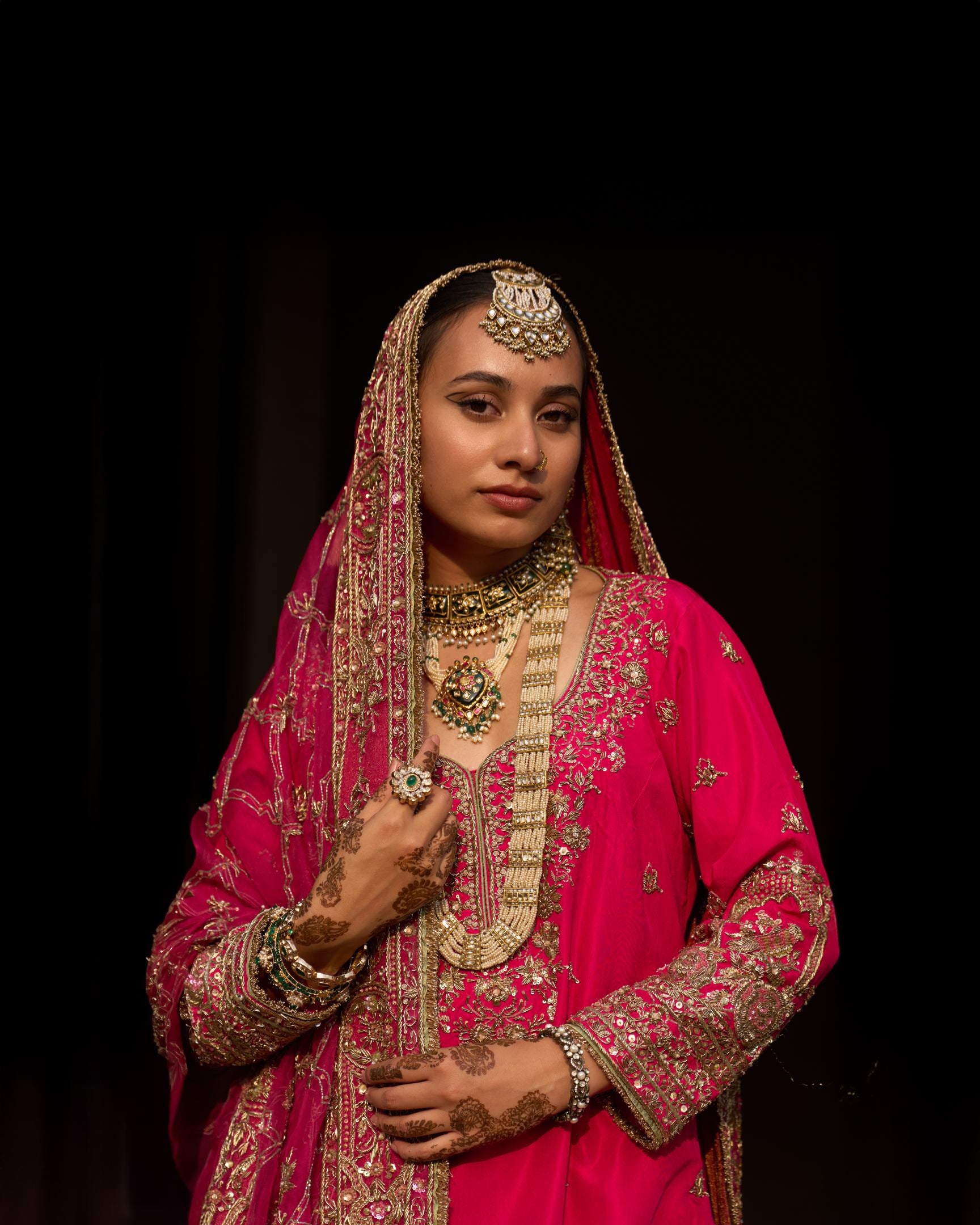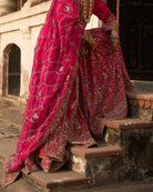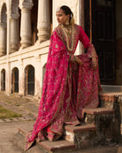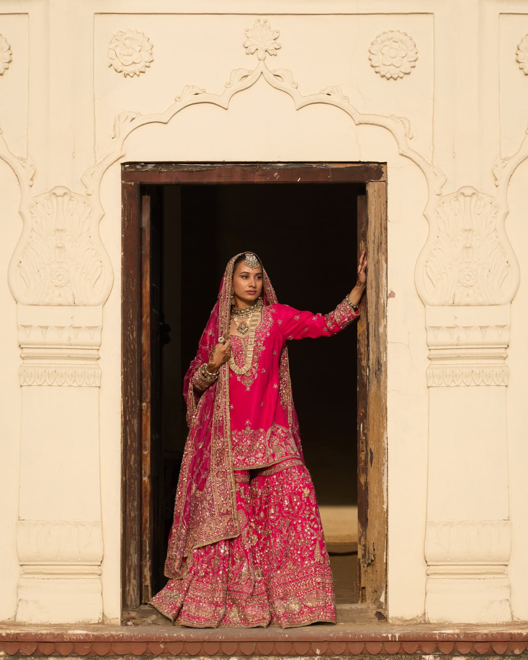 A breathtaking magenta garara, crafted for true royalty, richly adorned with intricate hand-done zardozi embroidery throughout. The heavy craftsmanship shimmers with timeless opulence, while the voluminous silhouette exudes grandeur and regal charm.