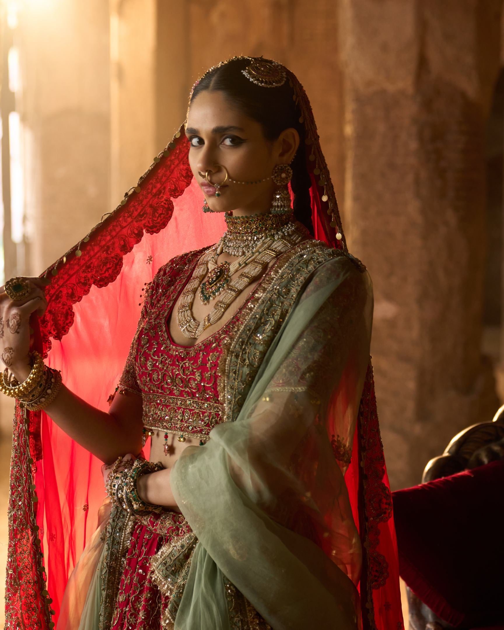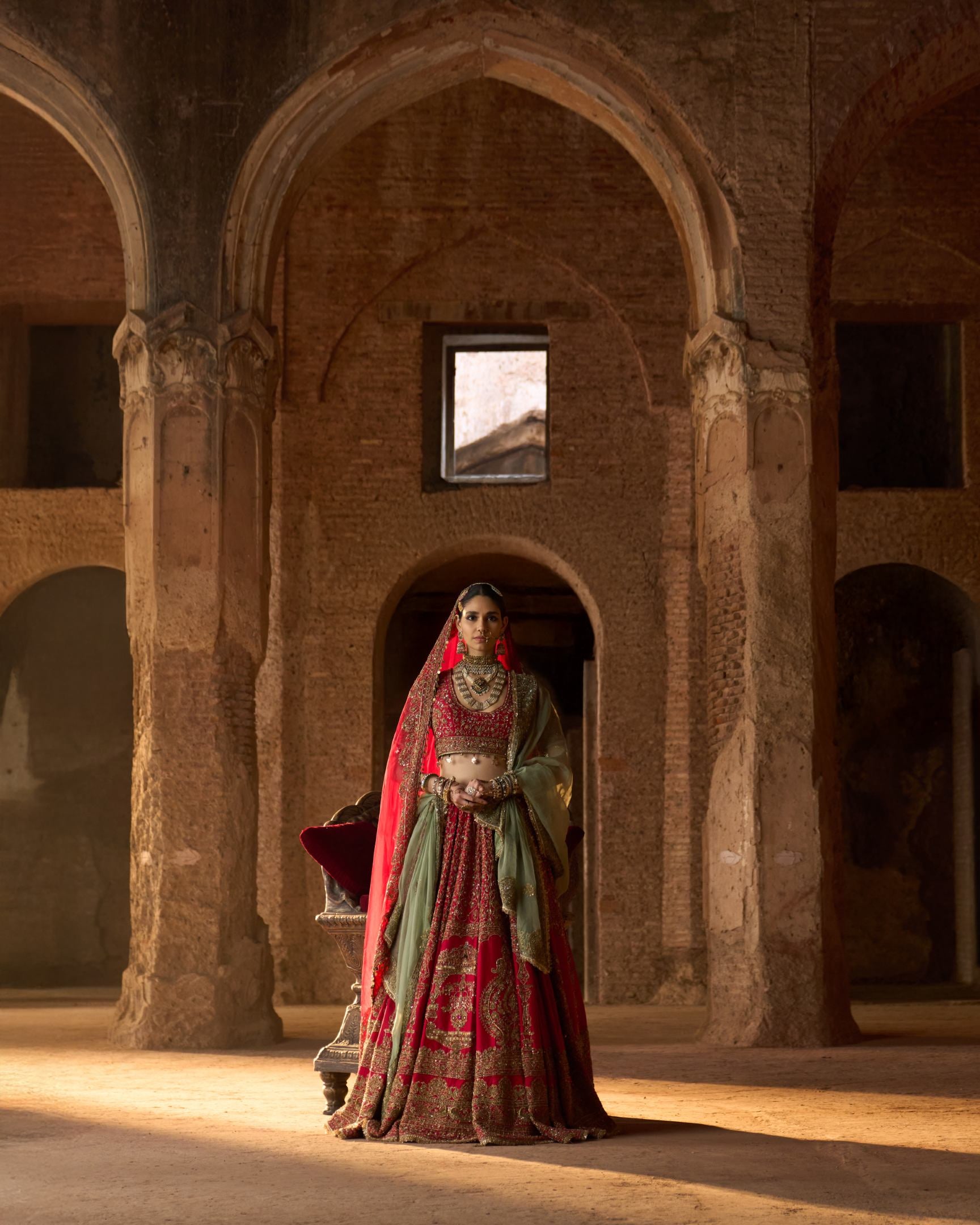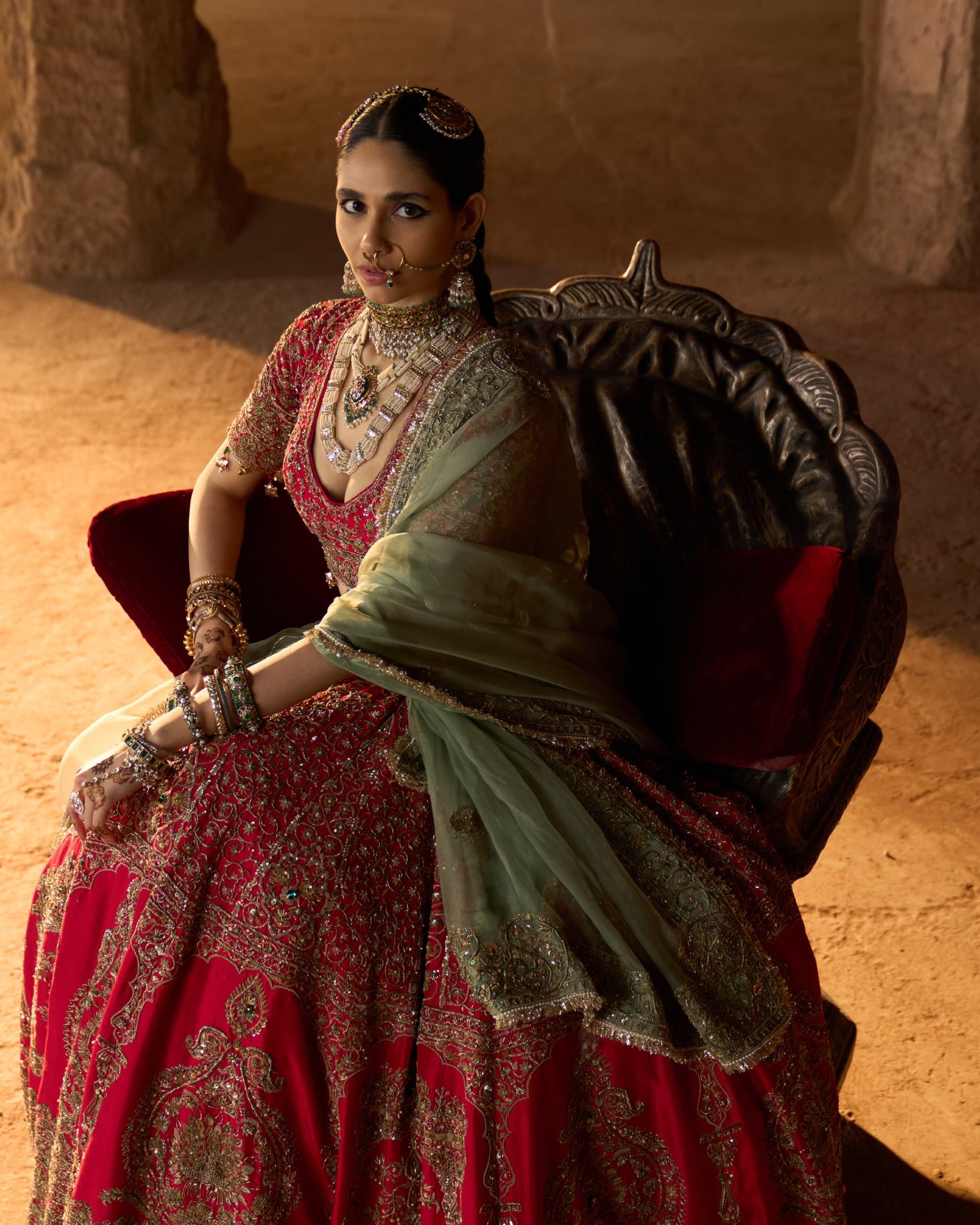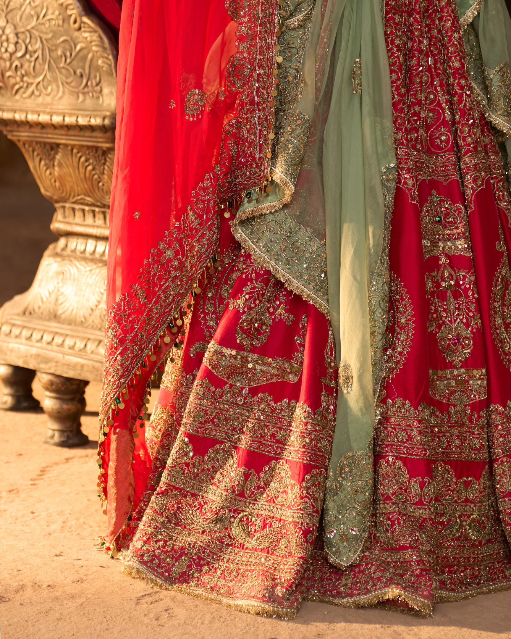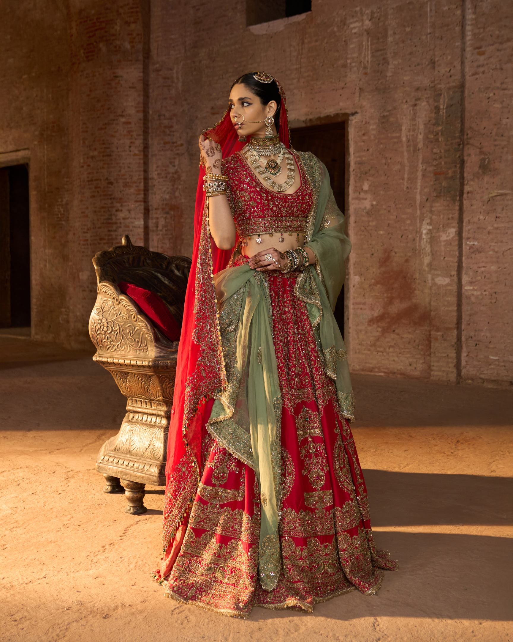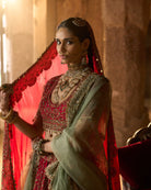 Inspired by the opulence of royal courts, this deep red bridal lehenga is richly adorned with all-over kora embroidery, echoing centuries of ceremonial craftsmanship. The contrast green dupatta adds a regal balance, long associated with prosperity and dynastic pride. Steeped in tradition and authority, this ensemble embodies timeless heritage and royal grace.