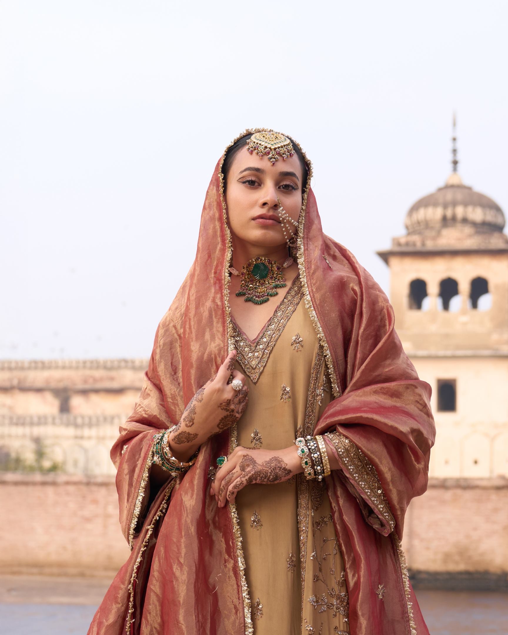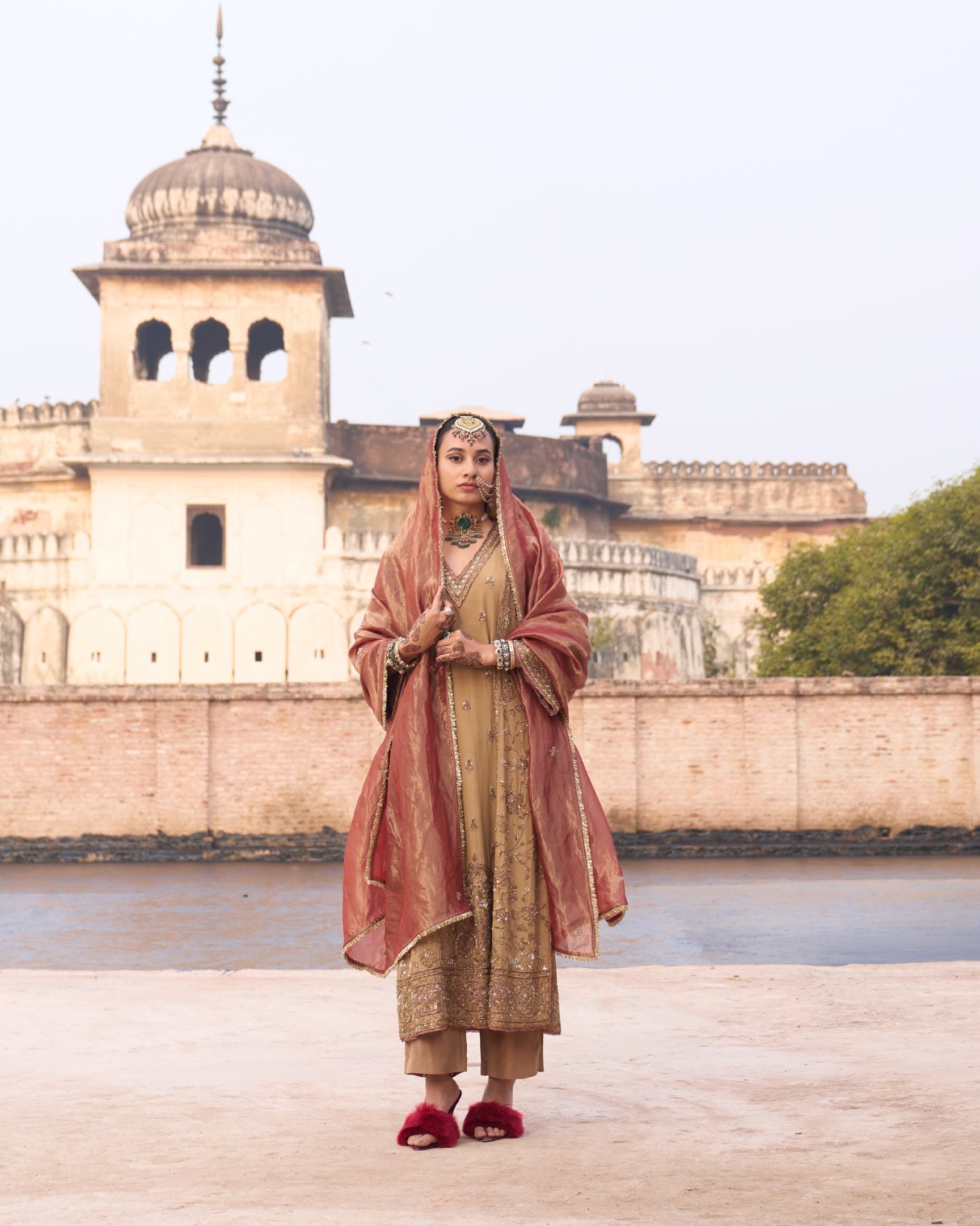 A masterpiece of craftsmanship, this beige and rust suit is adorned with intricate full handwork, blending earthy warmth with regal elegance. The contrasting hues and detailed embroidery create a harmonious balance of tradition and sophistication, making it perfect for festive occasions and wedding celebrations.