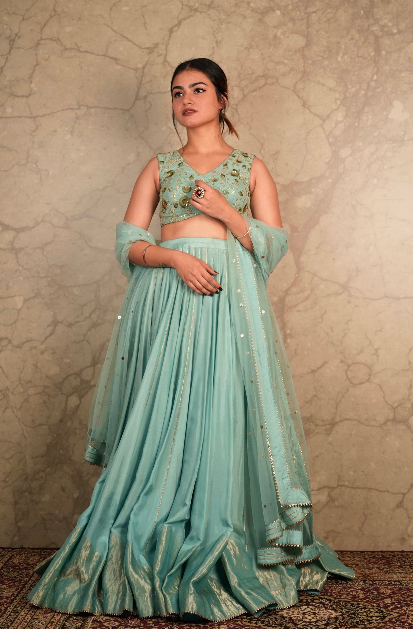 Contains 3 pieces - Pure georgette blouse (tafta lining), art silk lehenga (cotton lining) and net dupatta
