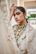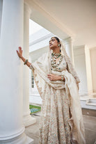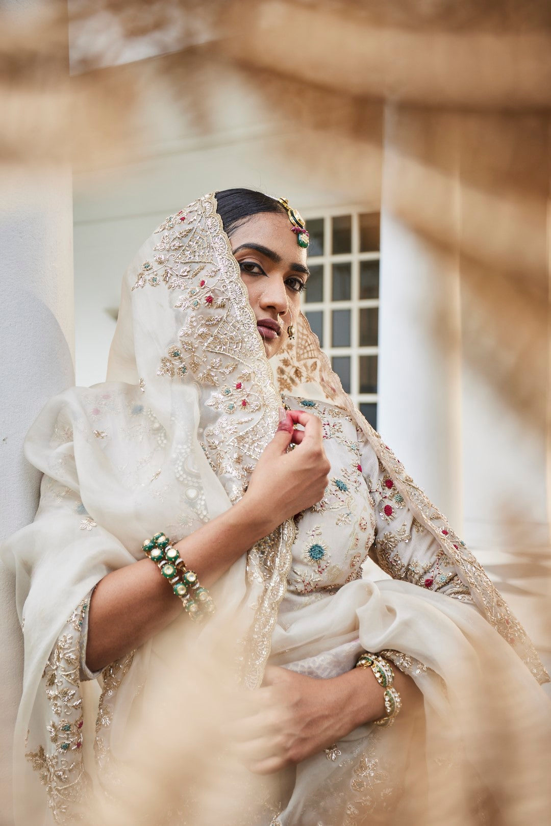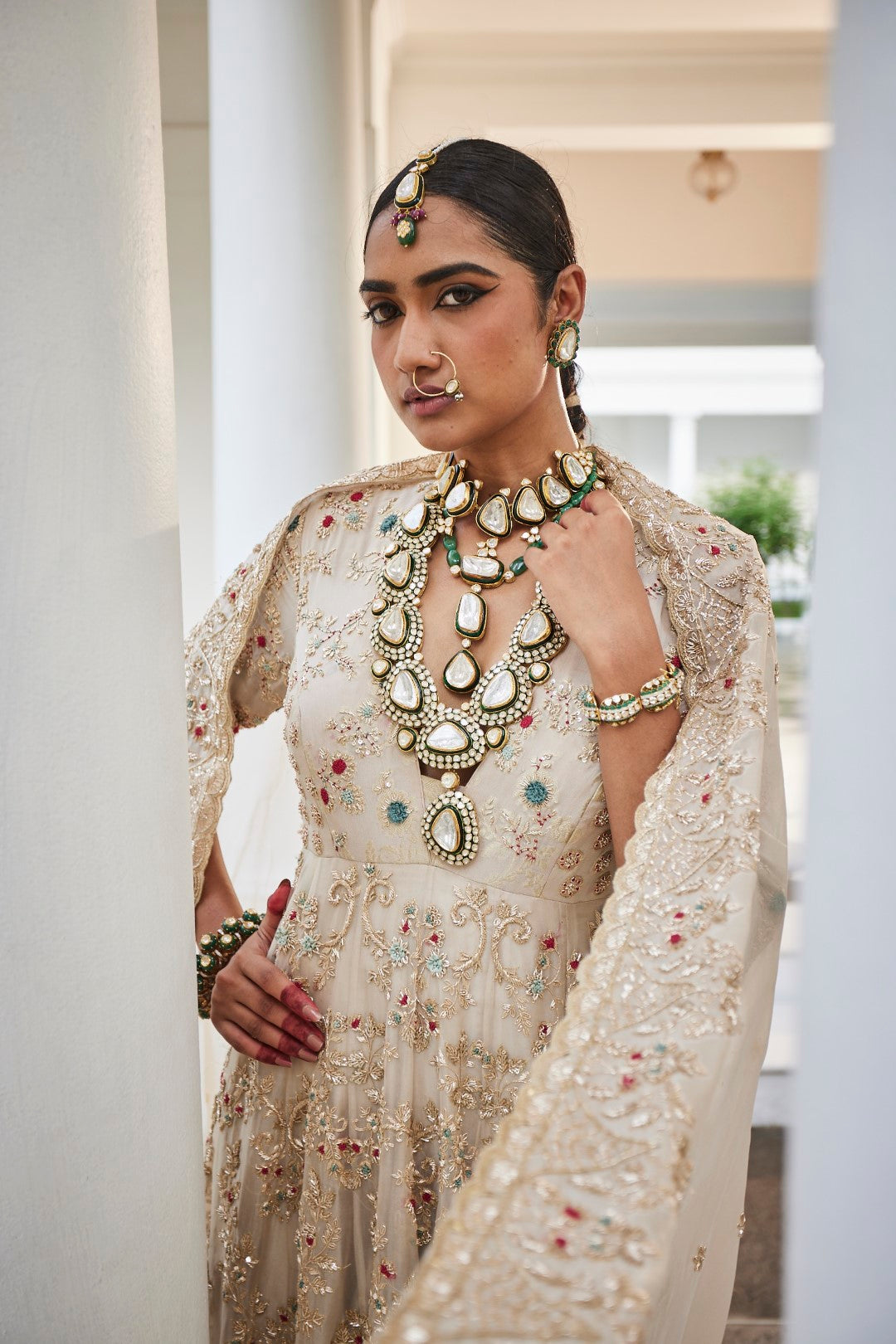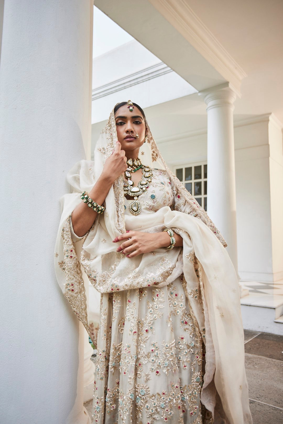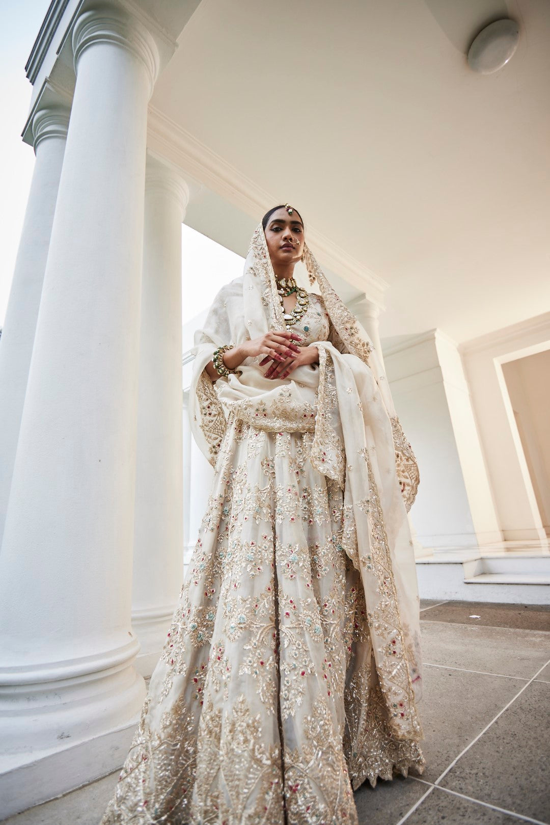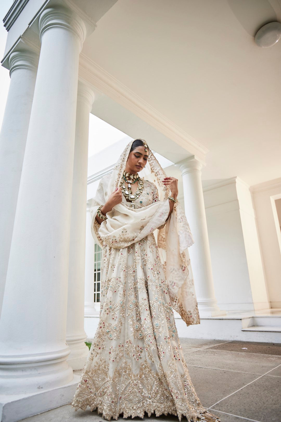 An elegant floor-touching embroidered Anarkali dress, perfectly complemented by a sheer organza dupatta, epitomising timeless grace and sophistication."