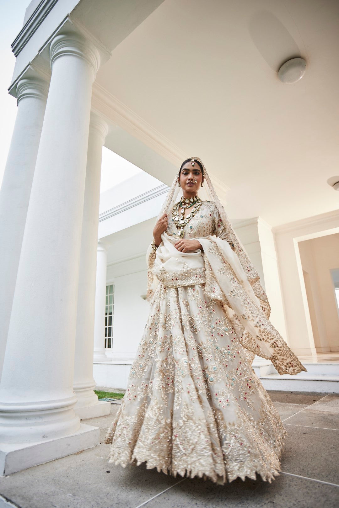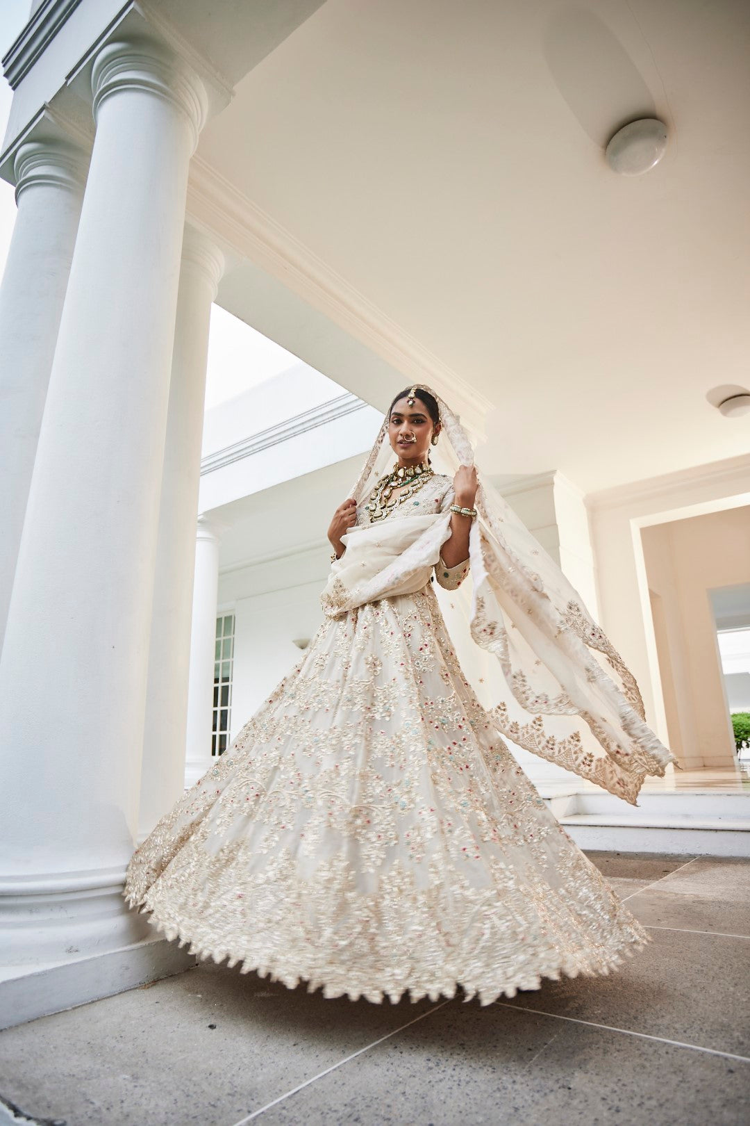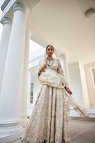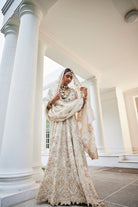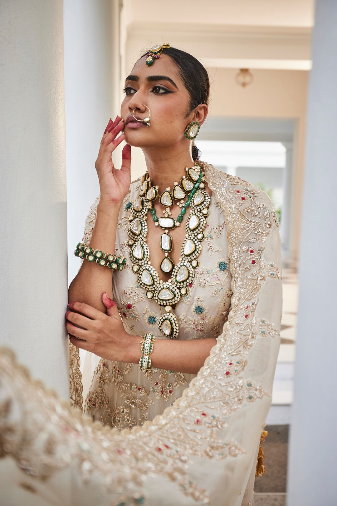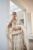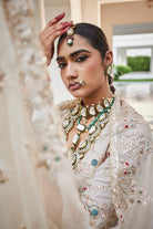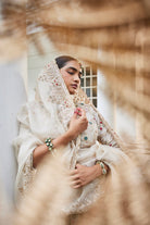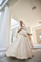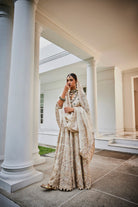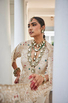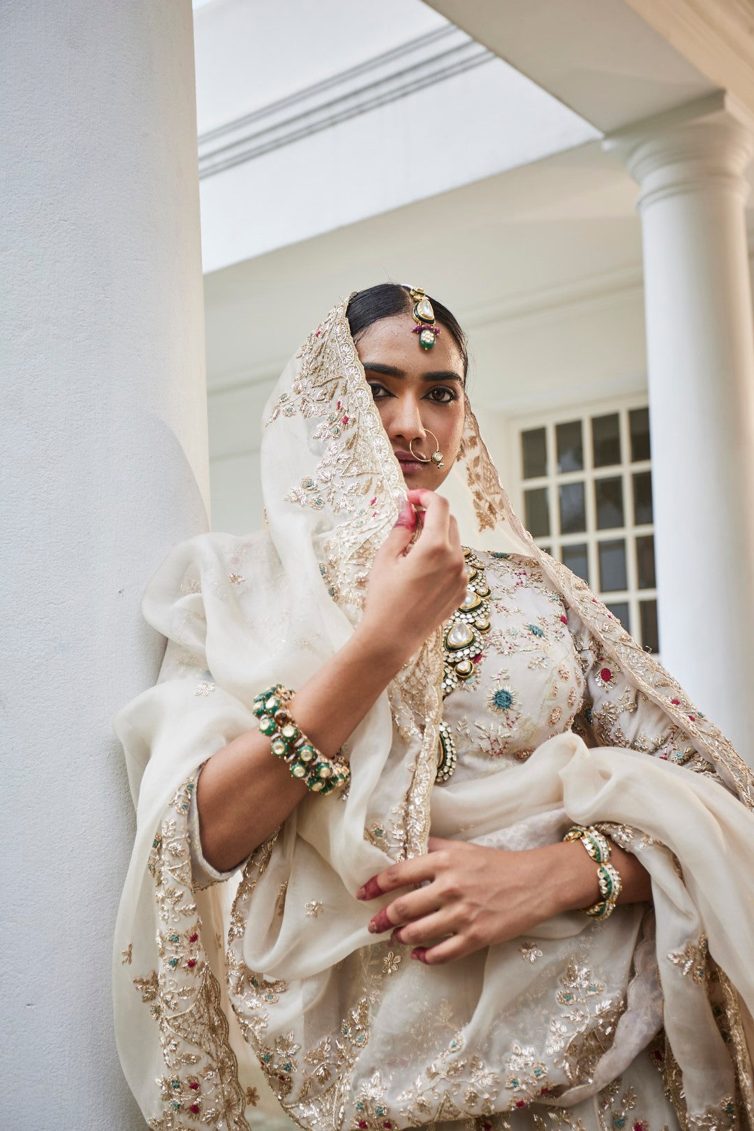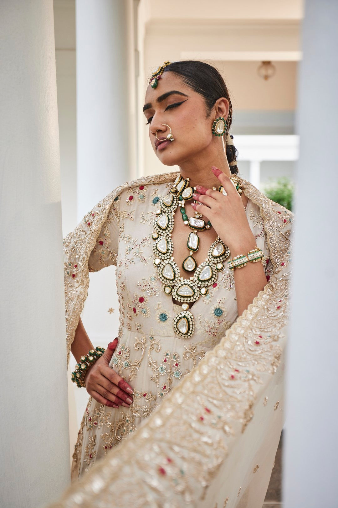 An elegant floor-touching embroidered Anarkali dress, perfectly complemented by a sheer organza dupatta, epitomising timeless grace and sophistication."
