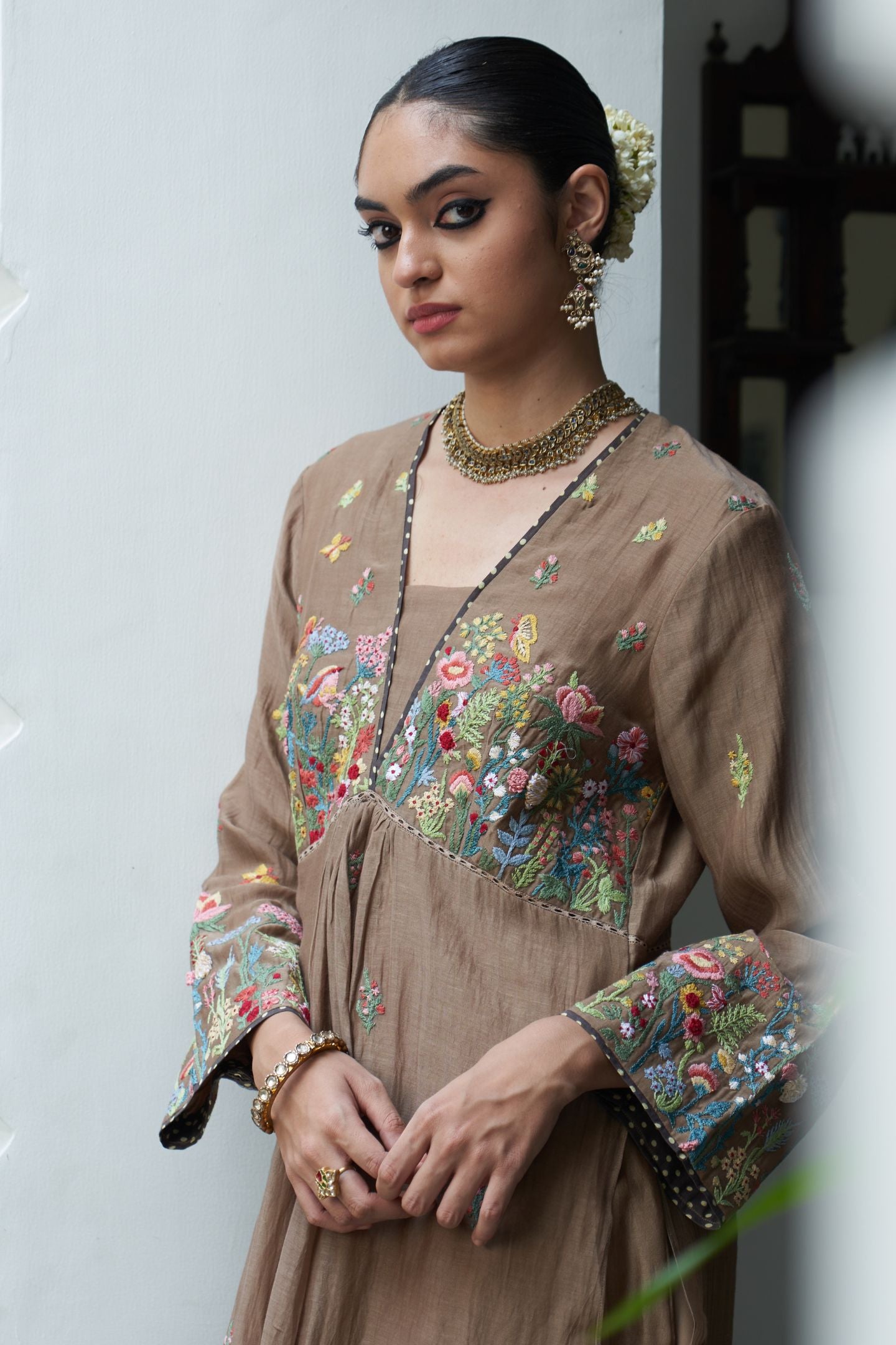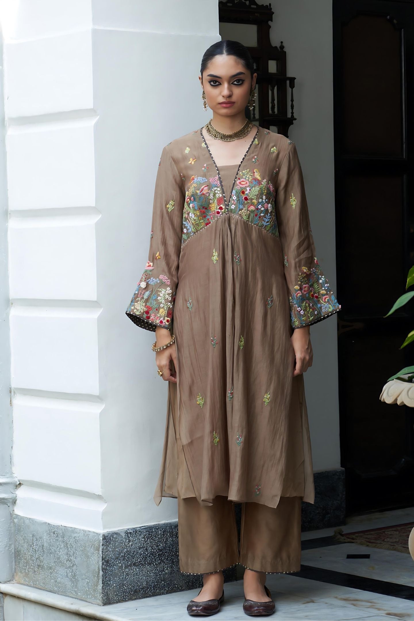 This outfit is crafted from pure fabric. To maintain its quality, colour, and finish, dry clean only is recommended