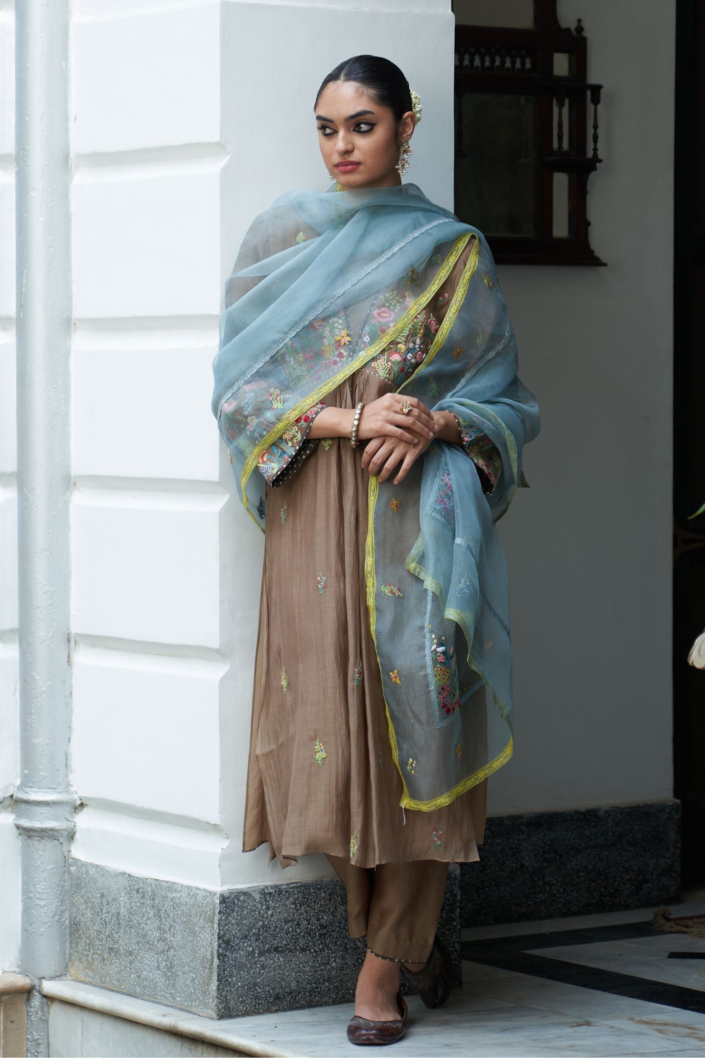 Perfect for sophisticated occasions, this ensemble exudes refined charm and grace. This is 3-piece beige Chanderi suit, paired with a powder blue Organza dupatta adorned with delicate thread embroidery.