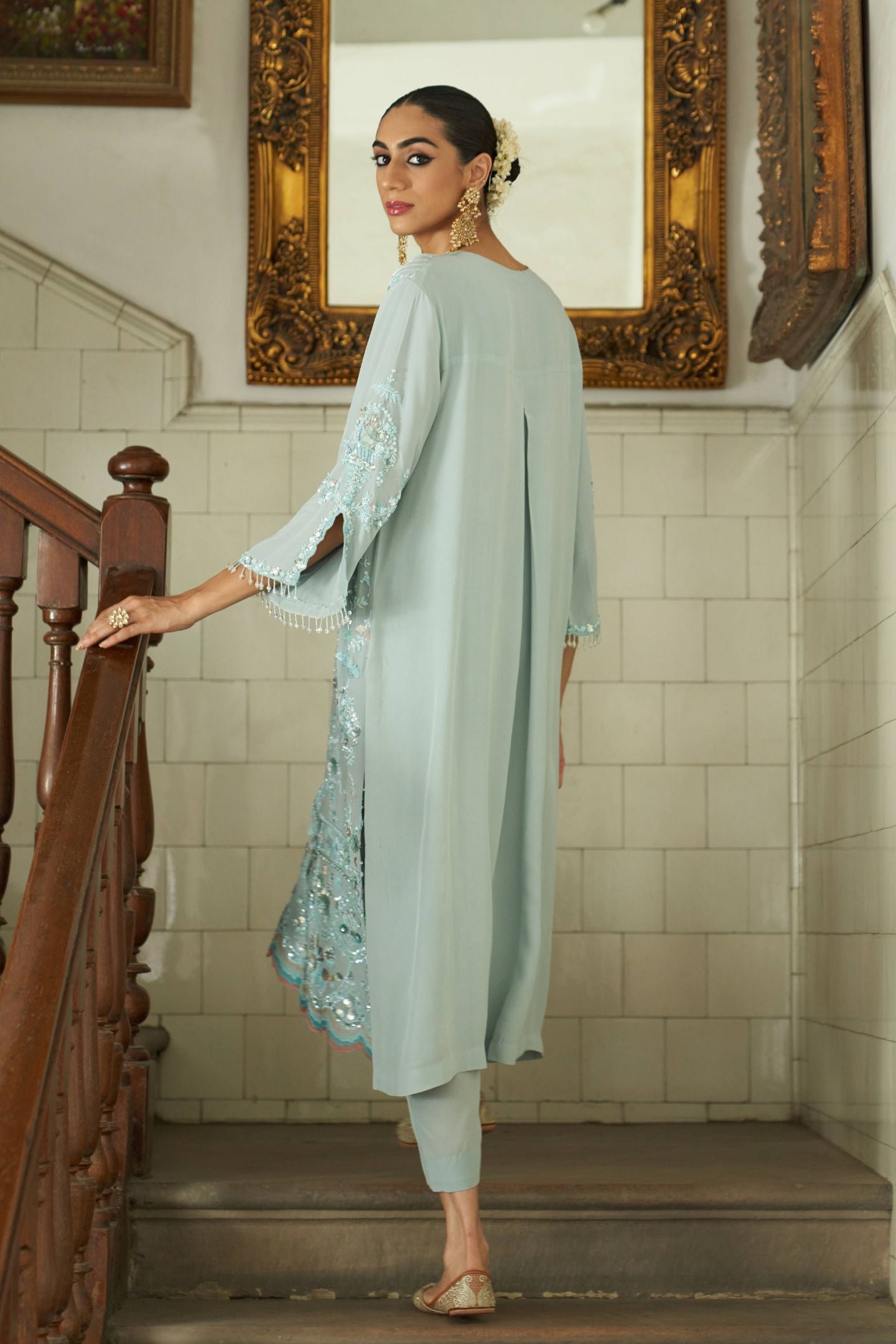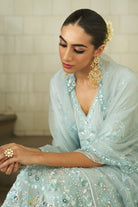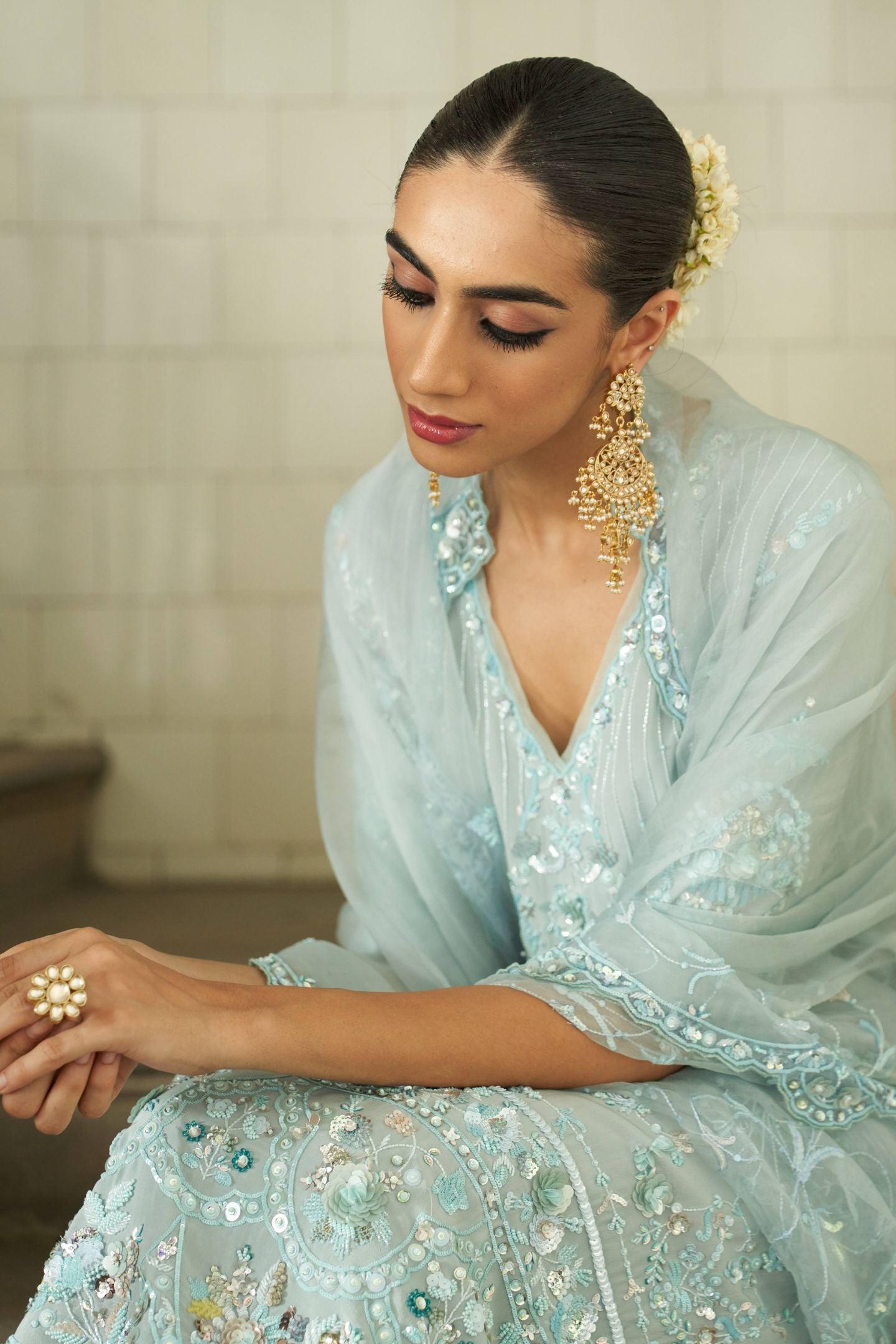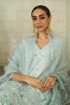 A ferozi crape suit paired with an organza dupatta adorned with heavy sippi, cutdana, and bead hand embroidery sounds absolutely exquisite. The combination of the rich fabric and intricate embroidery must create a stunning visual appeal, perfect for any special occasion.