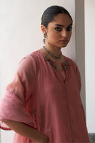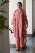 A Chanderi peach suit paired with linen pants sounds like a delightful choice for summer! The combination of Chanderi fabric's lightweight and airy feel with linen's breathable texture would indeed be perfect for staying cool in warm weather. The anchor thread embroidery along the neckline adds a touch of elegance, while the small flowers at the back bring a subtle yet charming detail to the outfit.