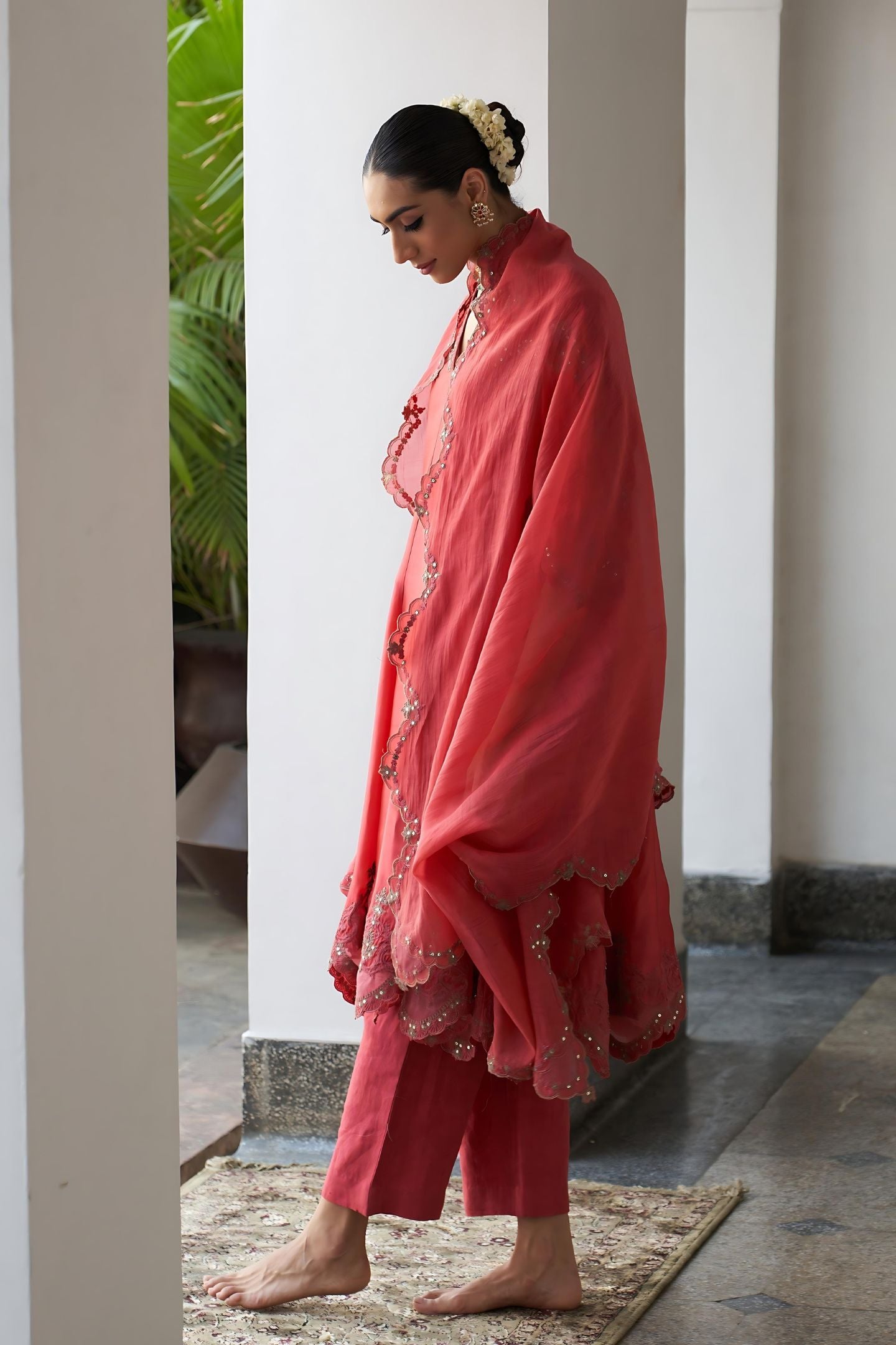 Contains 4 pieces - Chanderi shirt, art crape undershirt, linen pants and chander dupatta