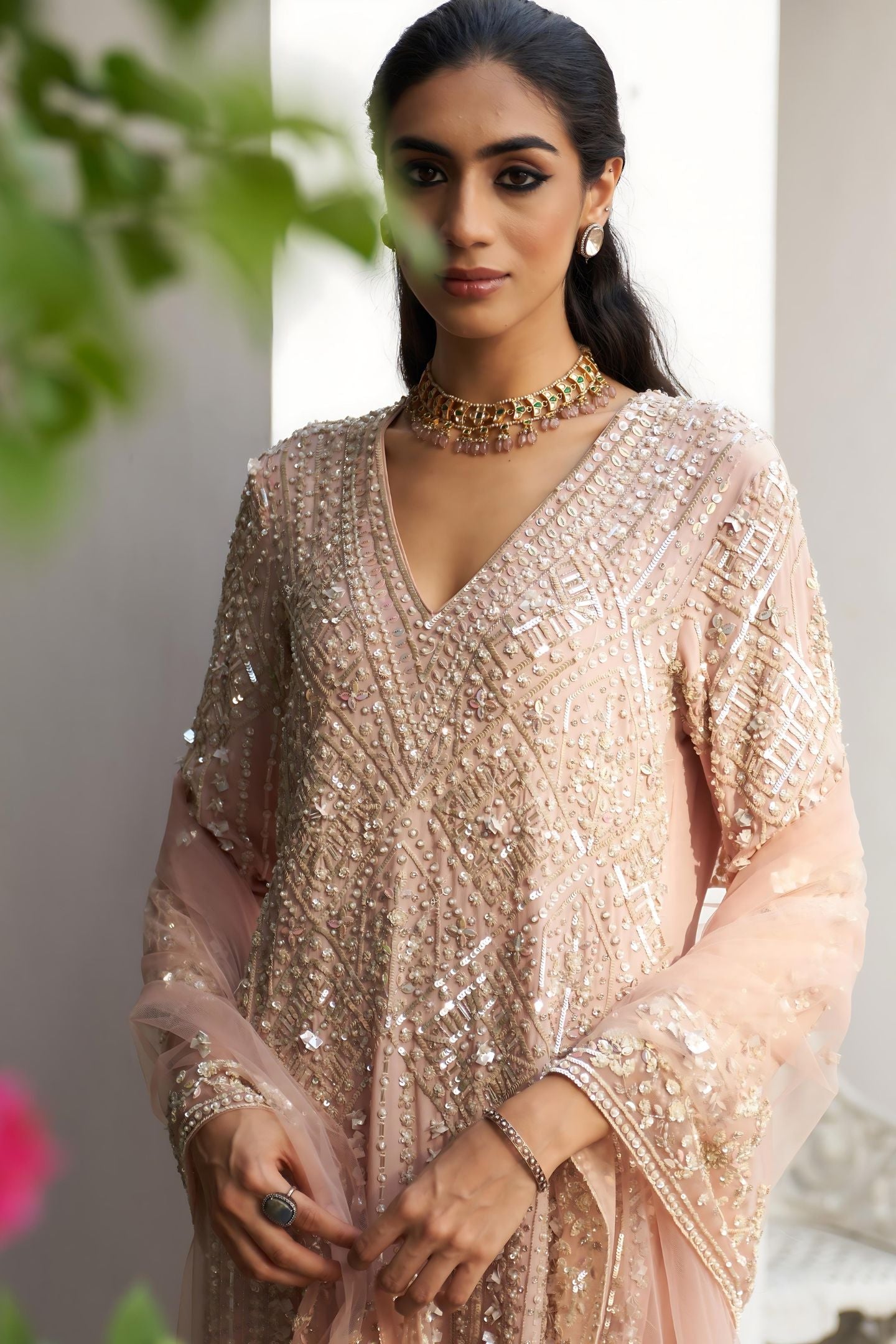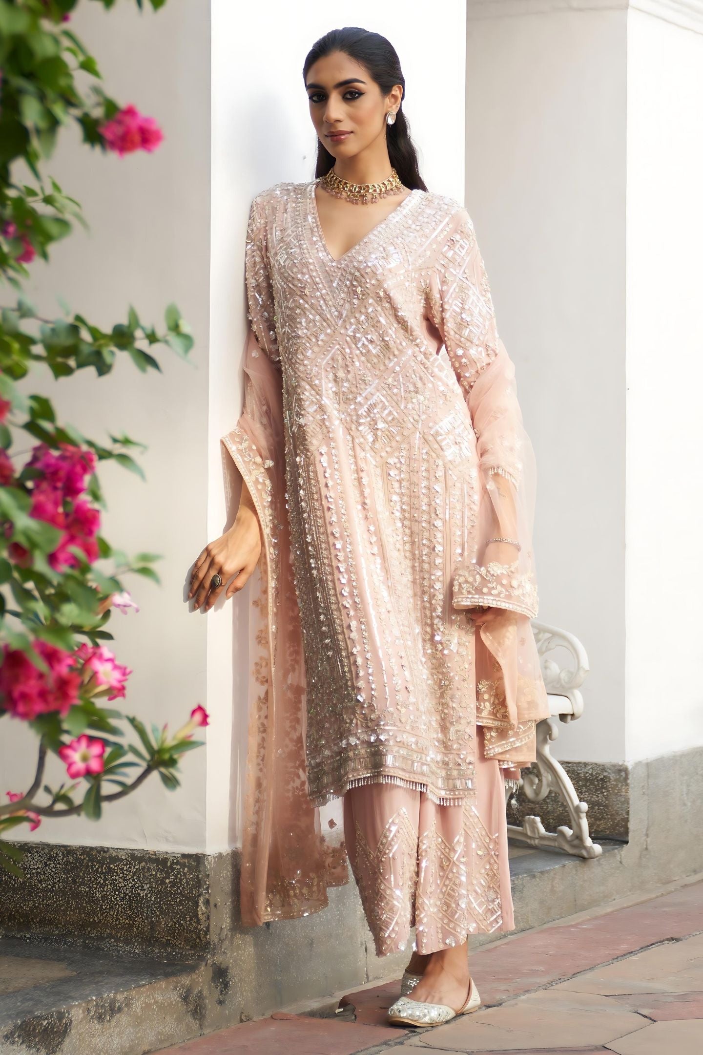 The combination of pure crepe fabric with intricate hand embroidery adds a touch of elegance and luxury to the outfit. The georgette lining would give it a smooth and comfortable feel against the skin, while the net dupatta adds a delicate and airy touch to the ensemble. It sounds like the perfect choice for a special occasion or event where you want to make a statement with your attire.