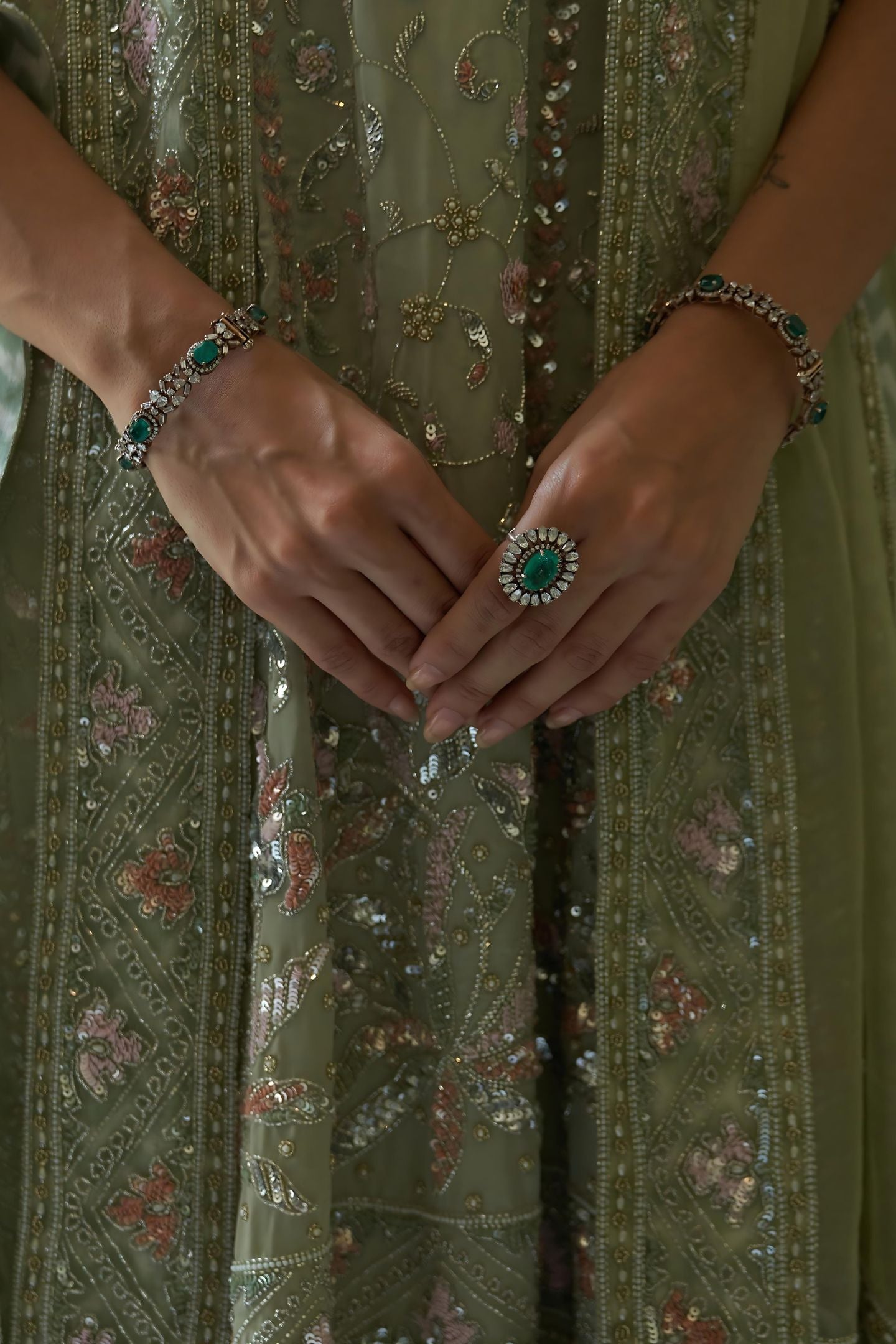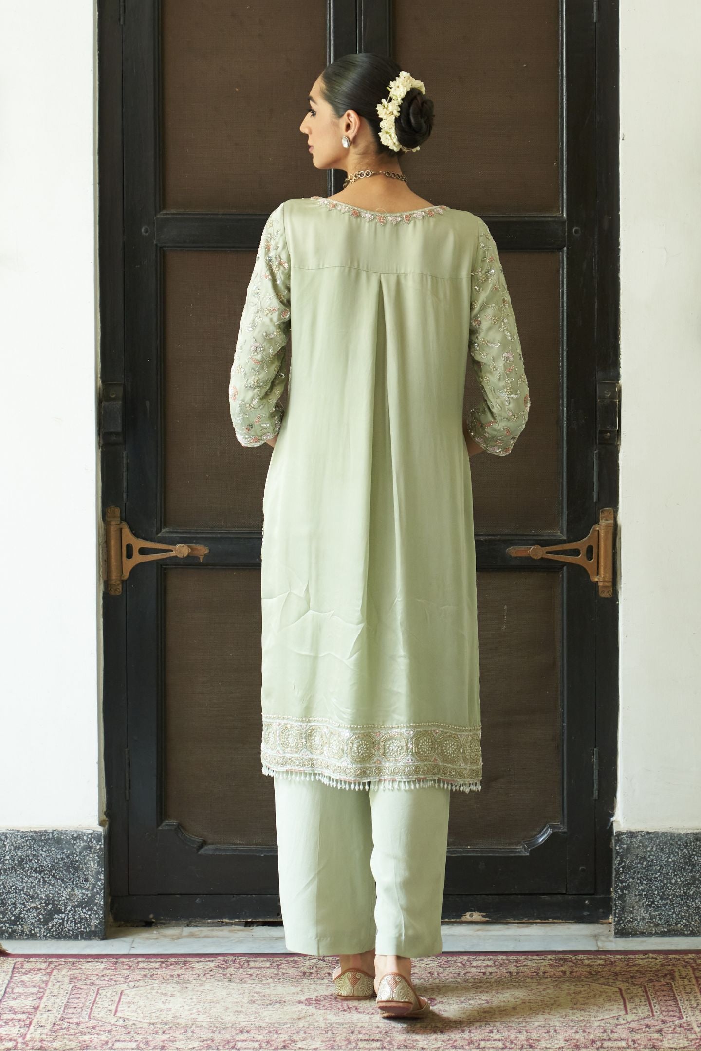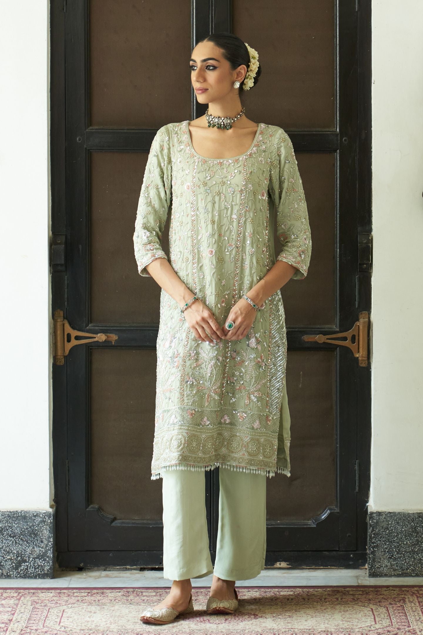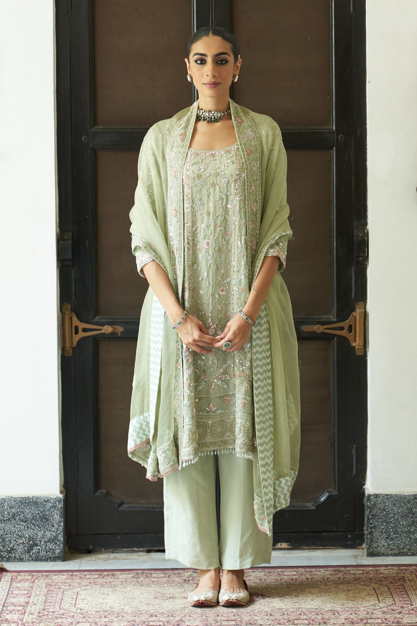 A three-piece ensemble in light green, adorned with opulent elegance the organza shirt, intricately embroidered with sippi, cutdana, and beads, exudes a timeless charm. Its crepe lining ensures a graceful drape, while the pure crepe pants offer comfort and sophistication, completing a look of unparalleled refinement.