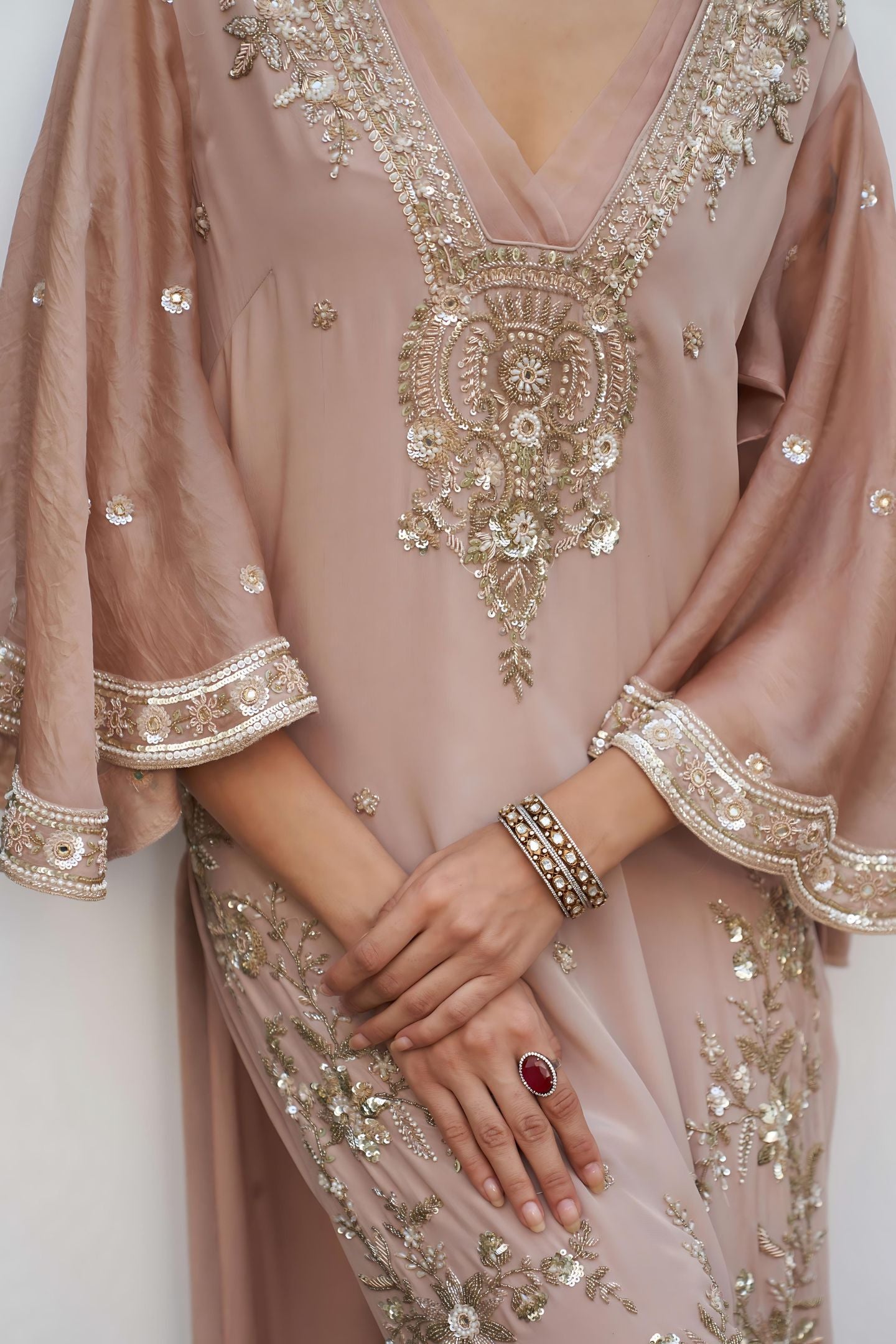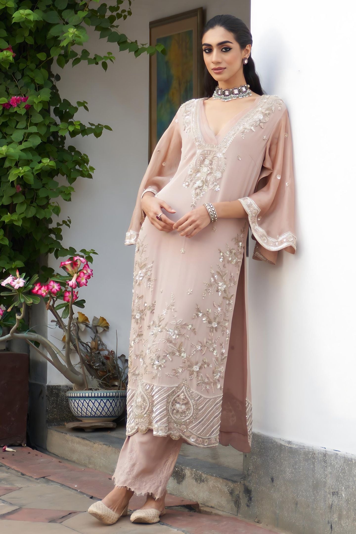 Embrace timeless style with this 2-piece peach crepe suit, featuring a lined kameez with elegant umbrella sleeves.