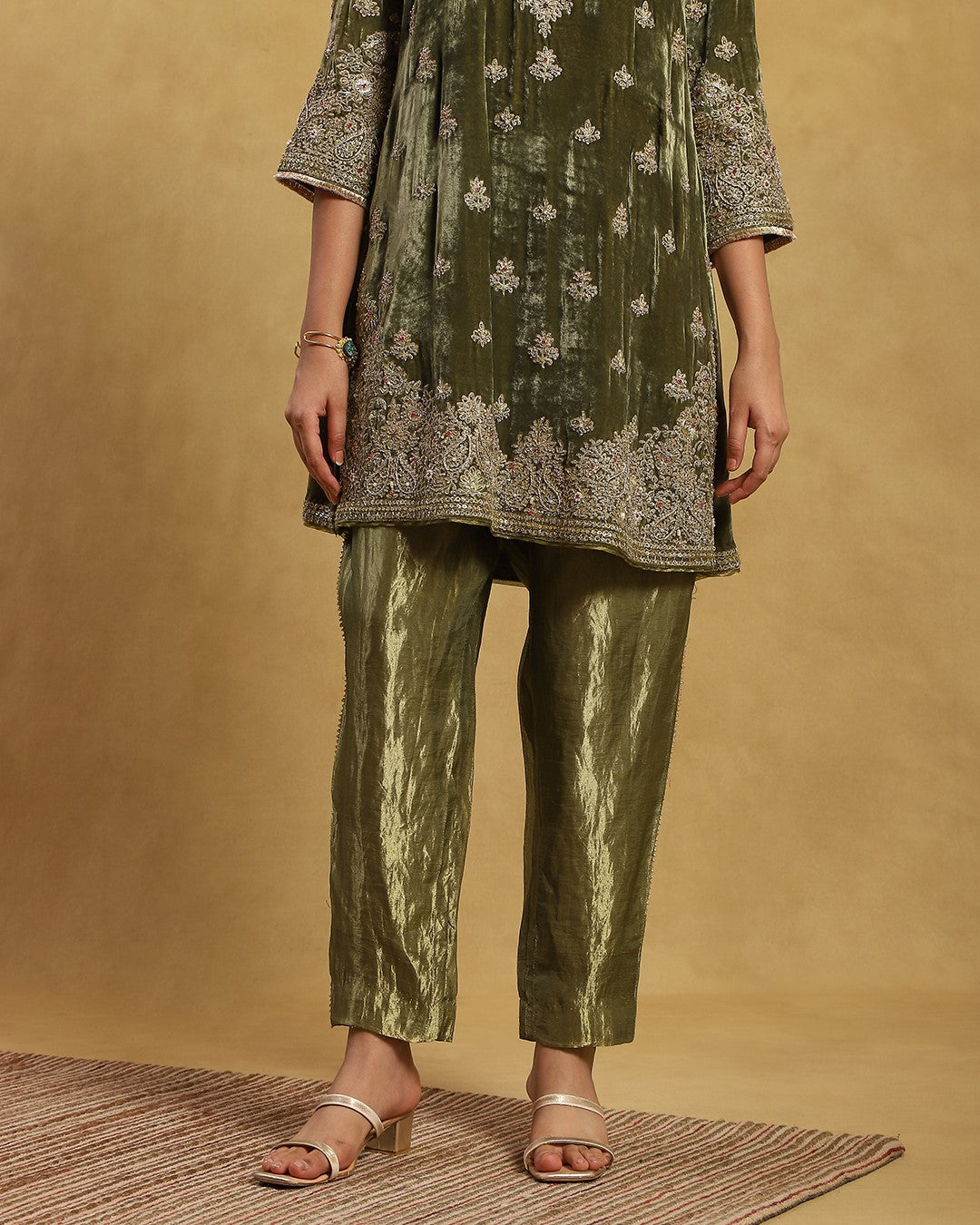 Contains 3 pieces - Pure velvet shirt (art crepe lining), Tissue pants (art crepe lining) & Organza dupatta