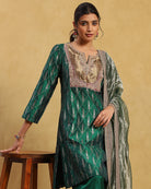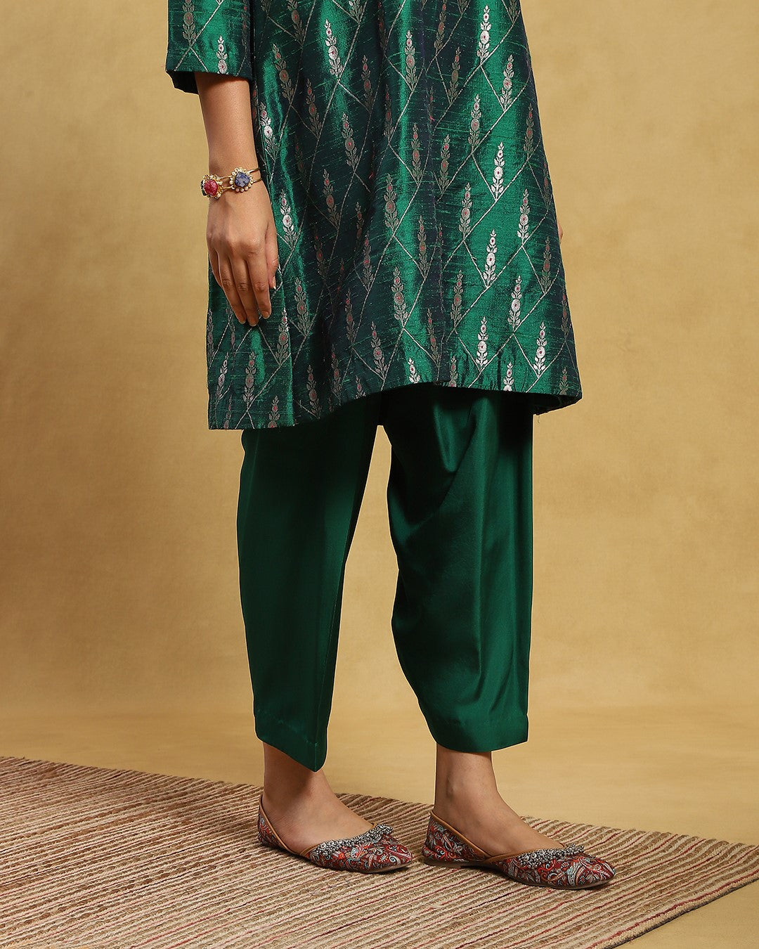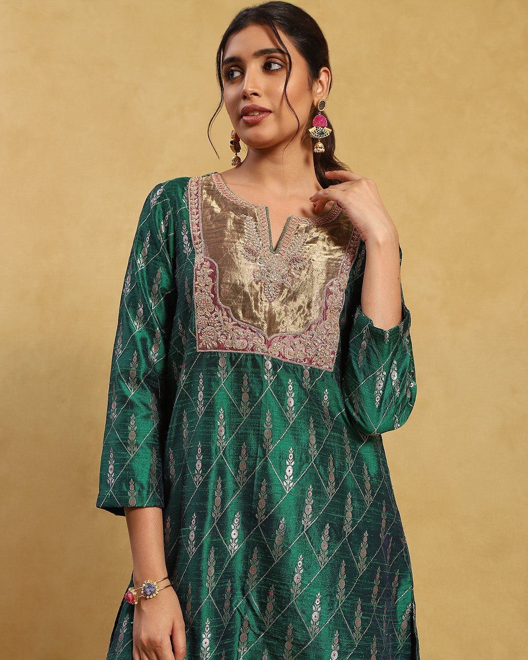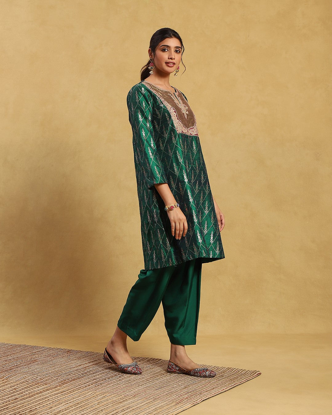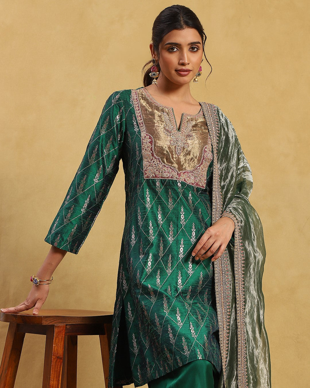 Contains 3 pieces - Brocade shirt (art crepe lining), Silk salwar (art crepe lining) & Tissue dupatta