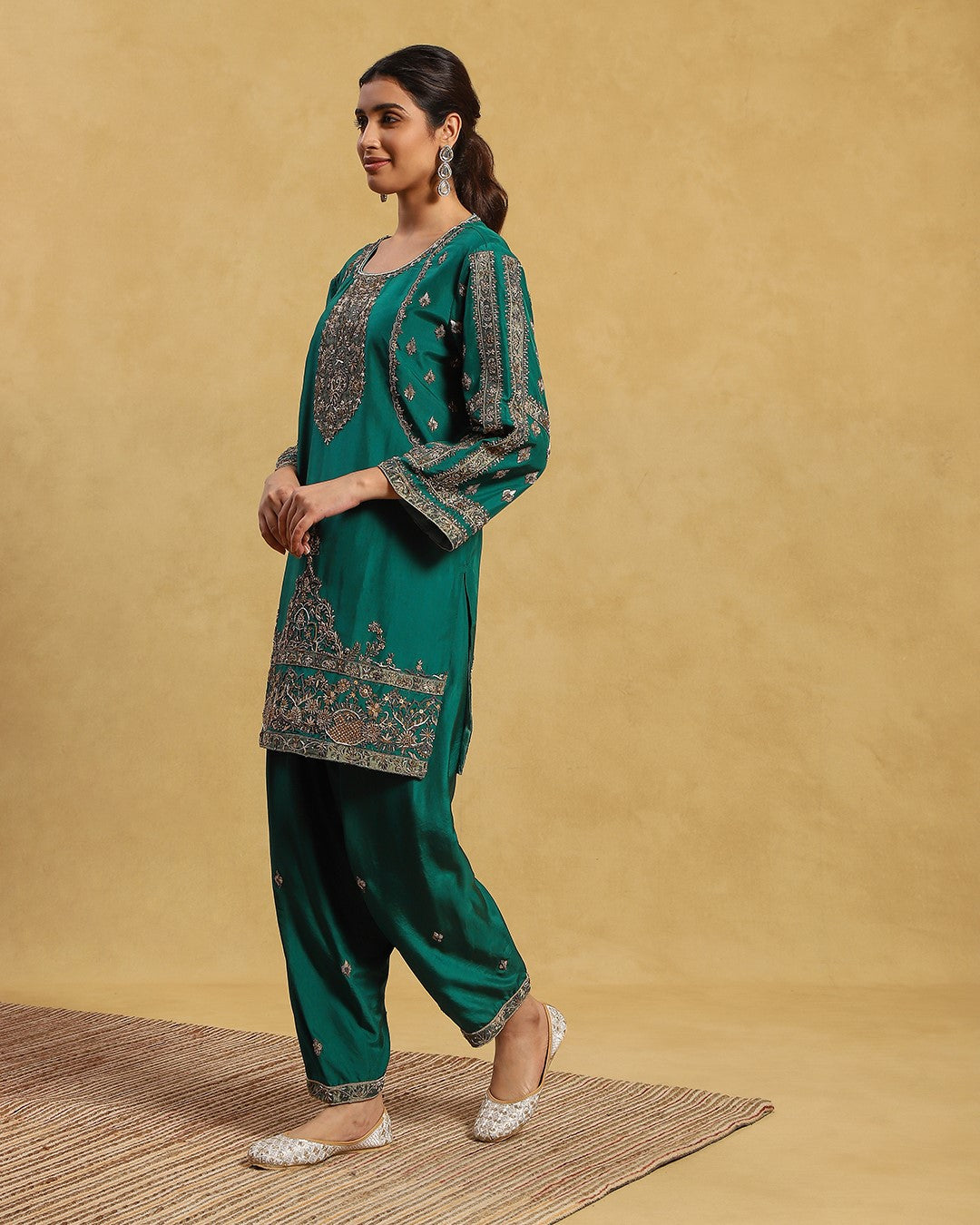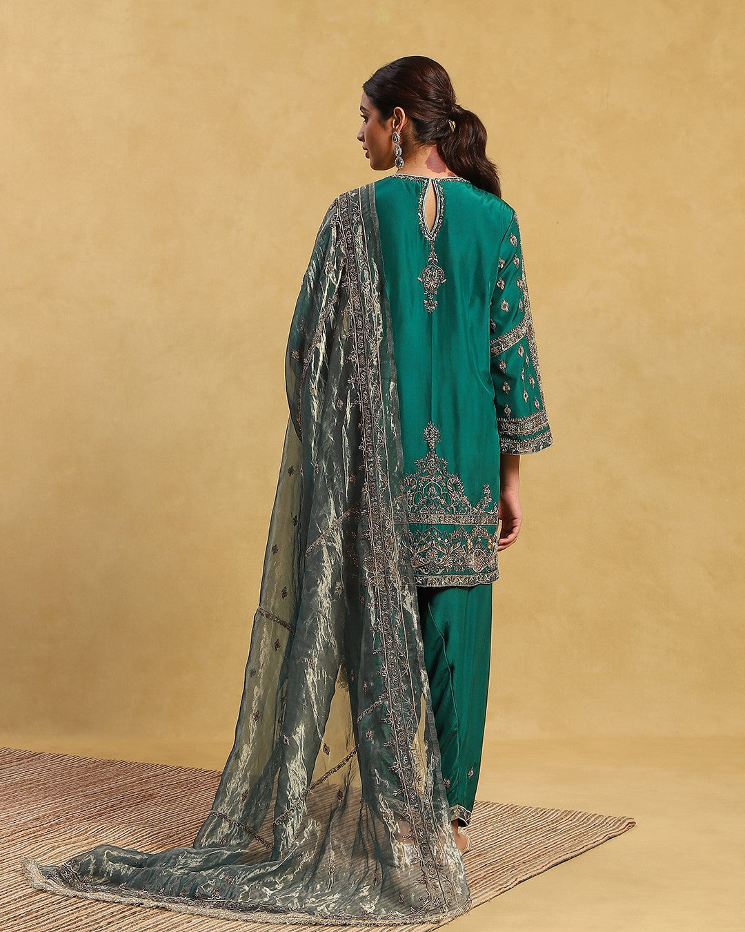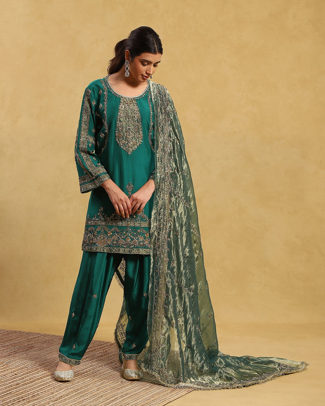 Contains 3 pieces - Pure silk shirt (art crepe lining), silk pants (art crepe lining) & tissue dupatta