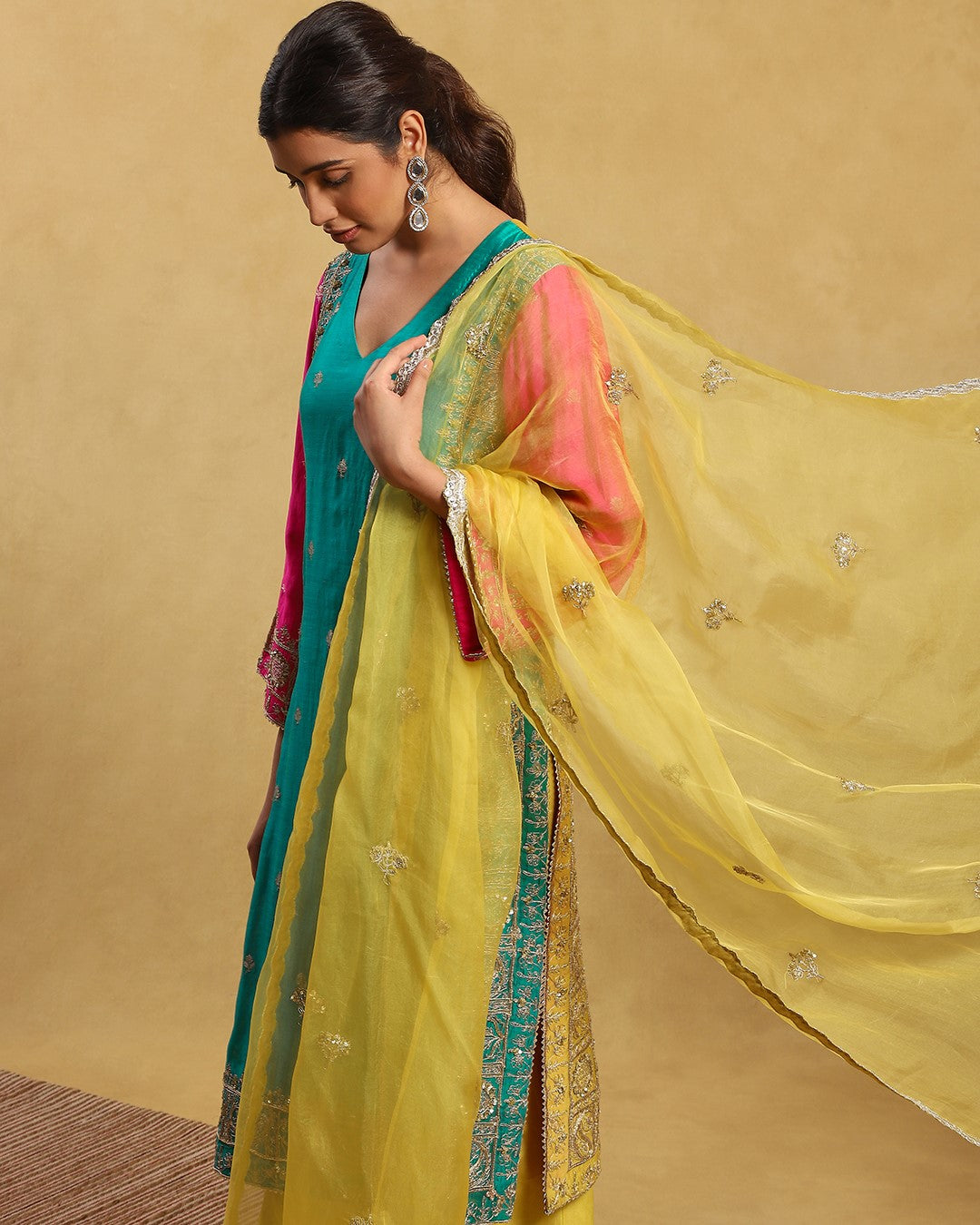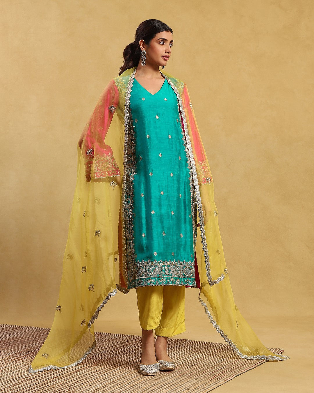 Contains 3 pieces - Pure silk butti shirt (art crepe lining), crepe pants (art crepe lining) & chinon chiffon dupatta