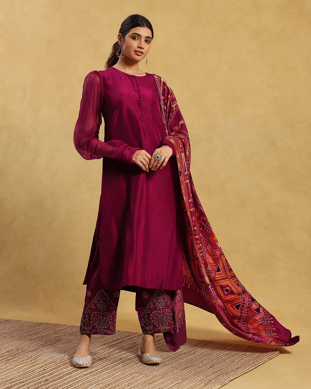 Contains 3 pieces - Pure silk shirt (art crepe lining), Silk pants & Crepe dupatta