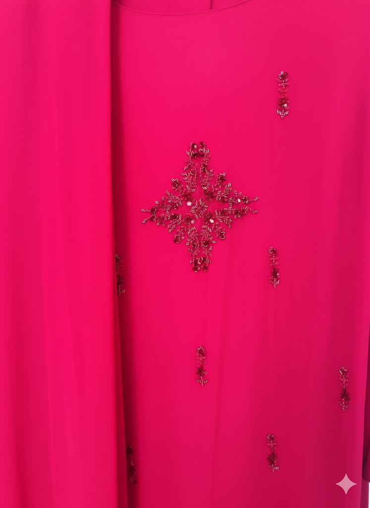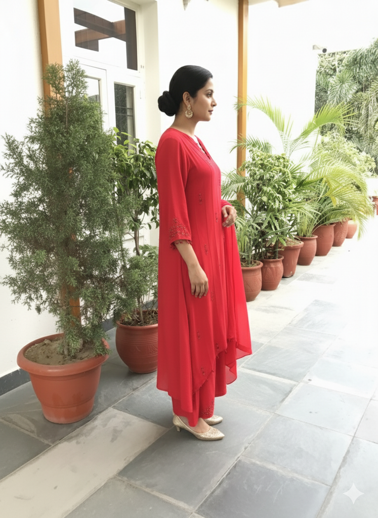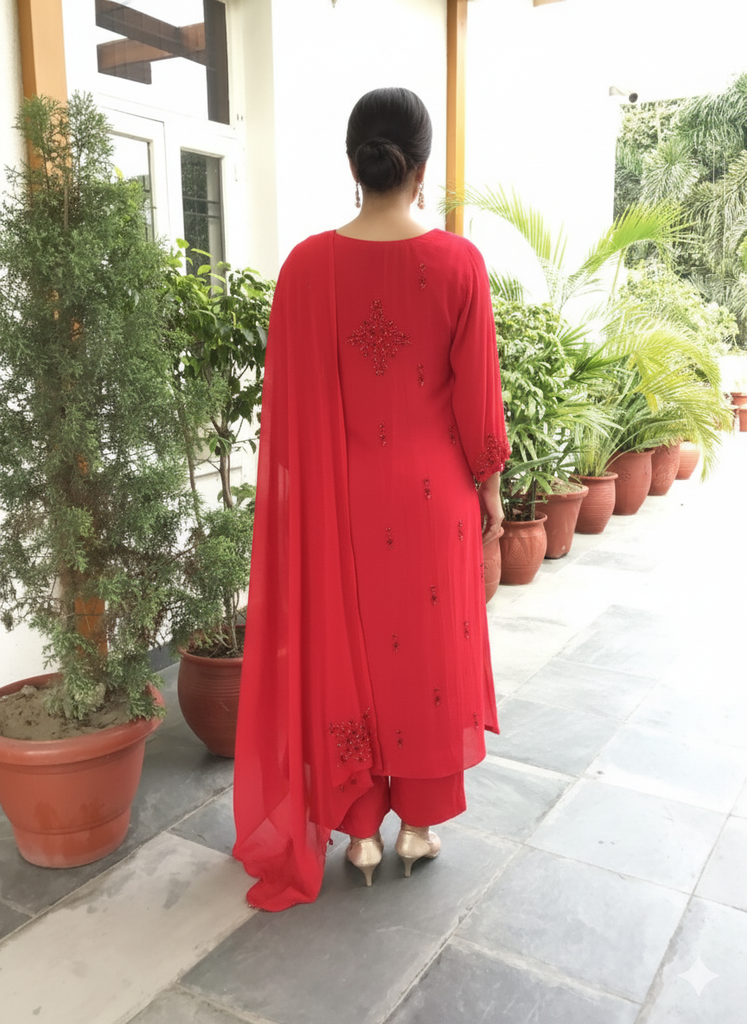 A vibrant cherry red georgette suit, designed in a flowy modern silhouette with subtle tone-on-tone embroidery. Lightweight, chic, and effortlessly elegant—perfect for those who love minimalism with a statement edge.