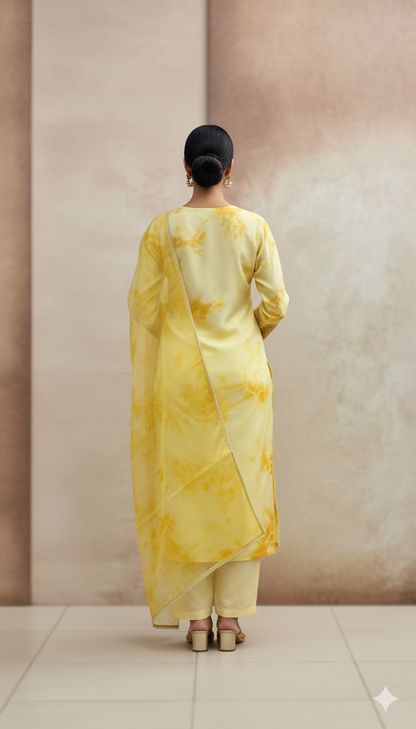 Bathed in the radiance of sunlit yellow tie & dye, this suit embodies festive grace. The neckline, adorned with intricate hand and aari embroidery, reflects age-old craftsmanship, adding a regal charm to its breezy silhouette.