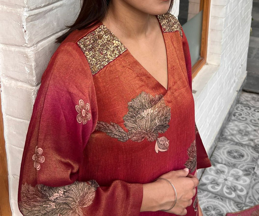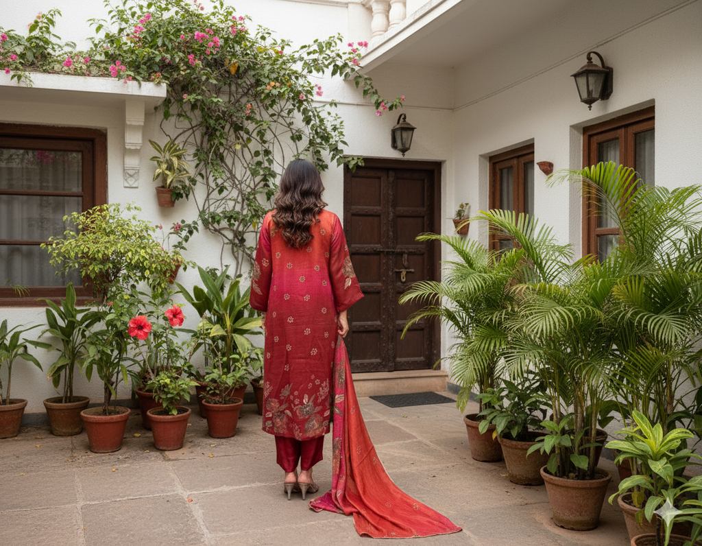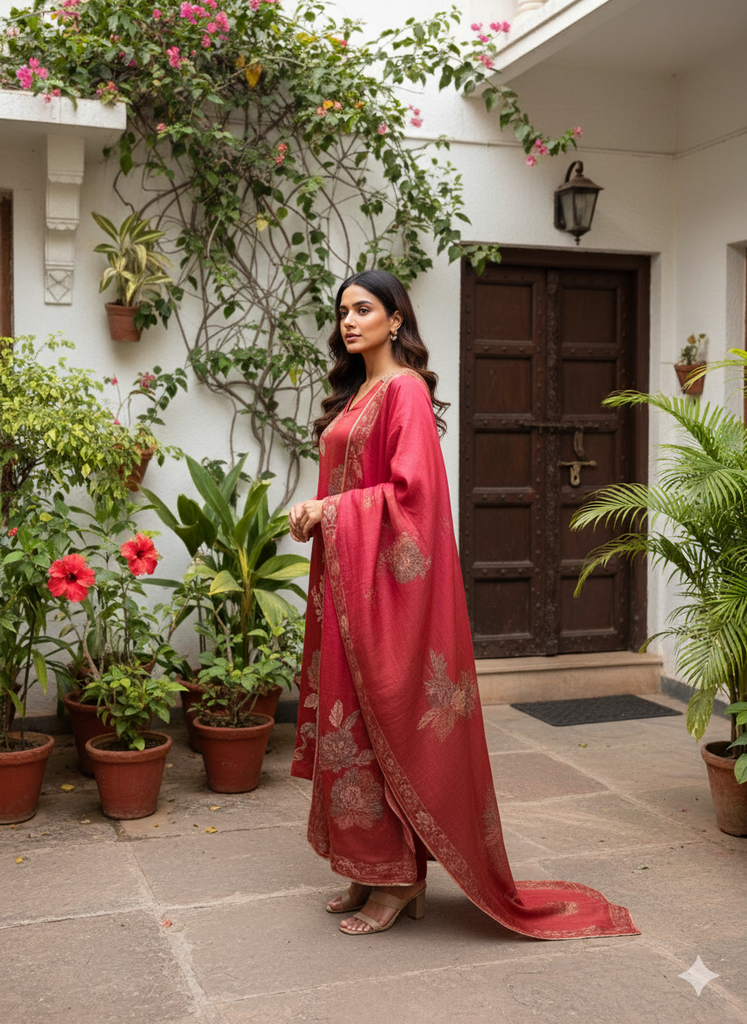 A masterpiece in surkh tissue, this suit glows with a soft shimmer that mirrors candlelit festivities. The delicate print enhances its charm, making it a blend of heritage artistry and contemporary allure—perfect for those who wish to stand out with understated elegance.