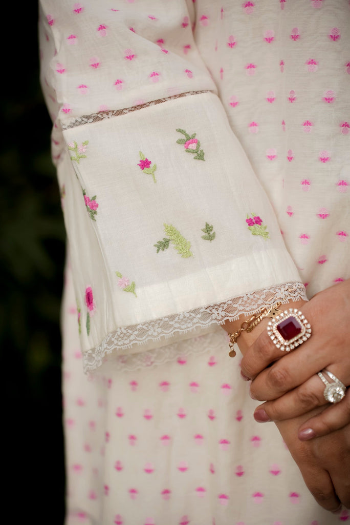 Step into summer with effortless grace in this White Chanderi Butti Fabric, designed to keep you cool and elegant even on the warmest days. The fabric is adorned with delicate butti motifs, and enhanced with intricate 3D thread embroidery on the front yoke and sleeves, adding depth and dimension to your ensemble.