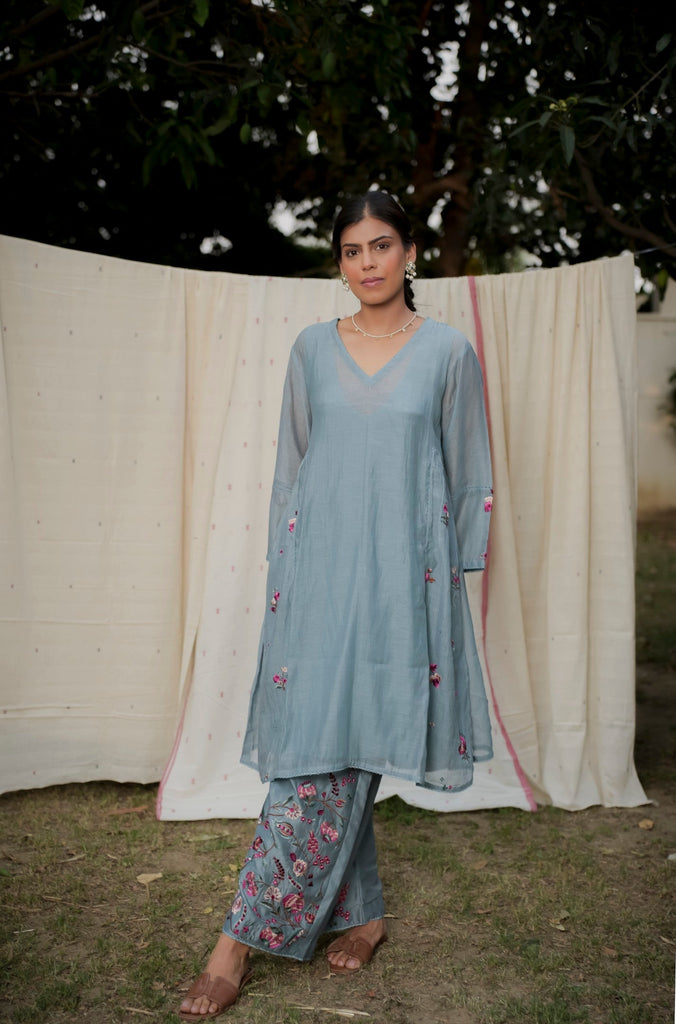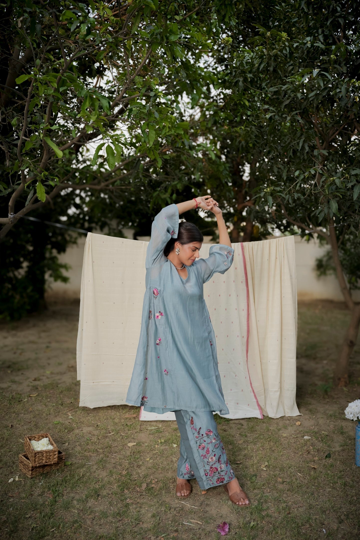 Elegant yet contemporary, this beautiful blue Chanderi suit has a modern and stylish silhouette with soft gathers on the sides, highlighted by delicate embroidery. It comes with shiny Chanderi pants that also have elegant embroidery, adding a touch of charm. The look is completed with a light organza dupatta featuring matching embroidery. A perfect outfit for festive occasions or special gatherings.