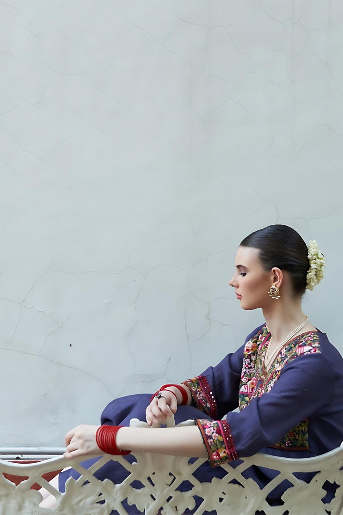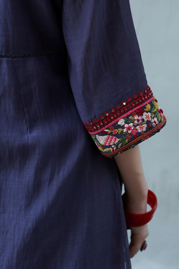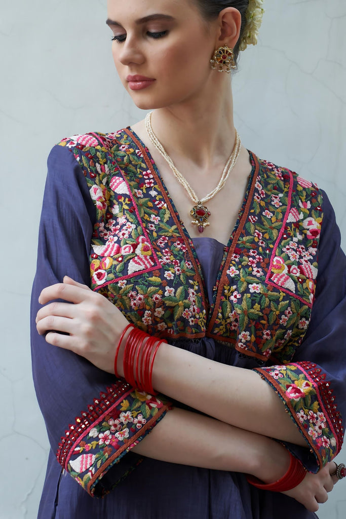 A dark purple Chanderi suit with crape lining features intricate thread embroidery on the chest, exuding elegance and tradition. The ensemble is paired with a sheer organza dupatta, adding a delicate touch. Perfect for festive events and formal gatherings, it combines luxurious fabrics with exquisite detailing.