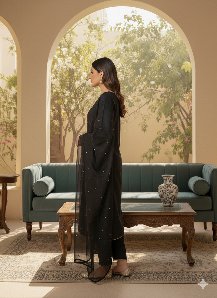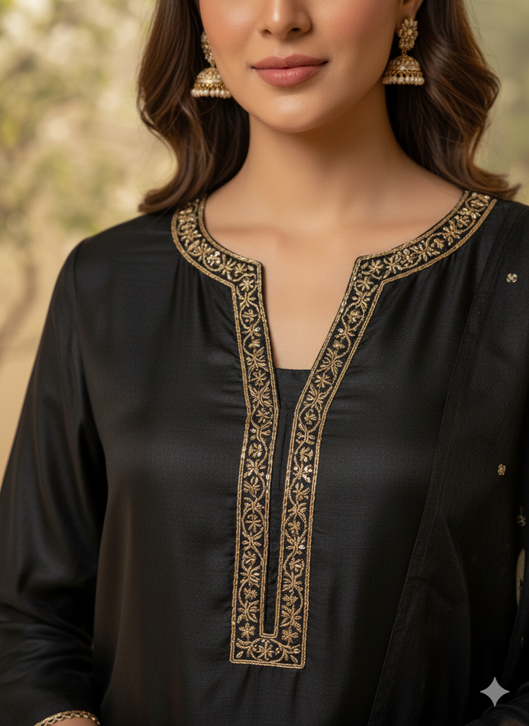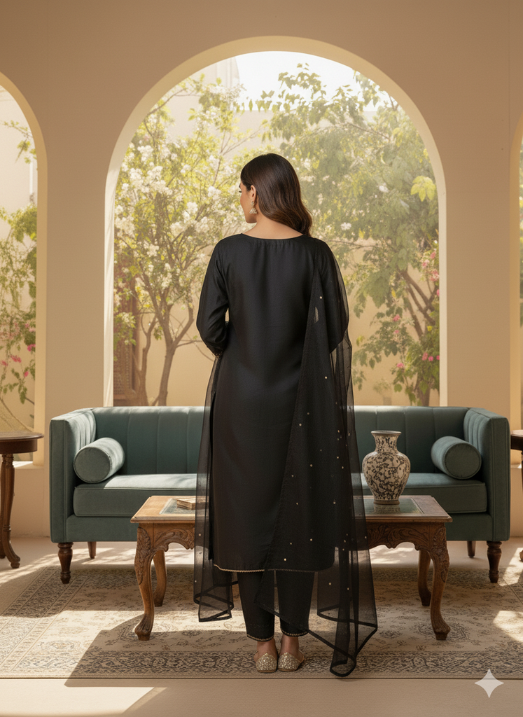 A timeless black silk suit crafted with understated elegance, adorned with minimal embroidery that enhances its natural grace. Perfect for evenings where sophistication speaks louder than embellishment.