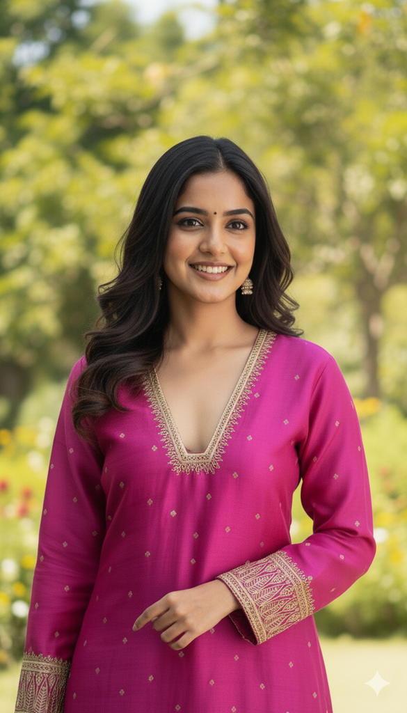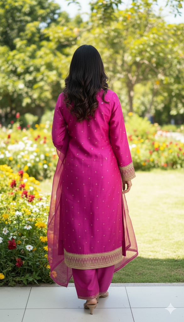Glowing in rani pink chanderi, this suit shimmers with golden buttis and is detailed with intricate aari work. An ode to heritage artistry, it radiates festive elegance with modern sophistication.