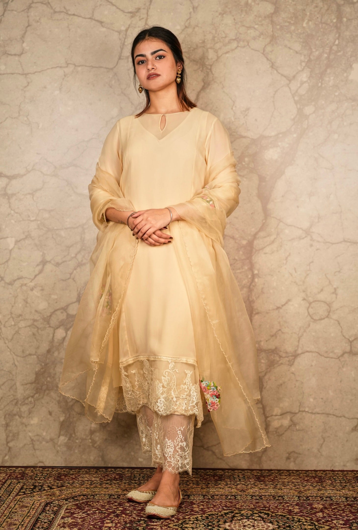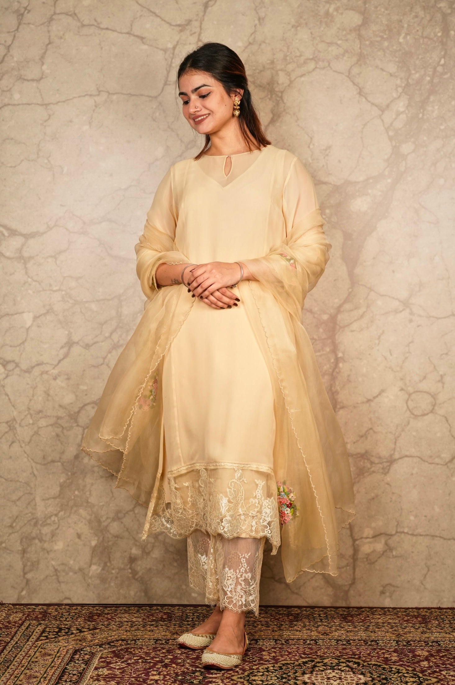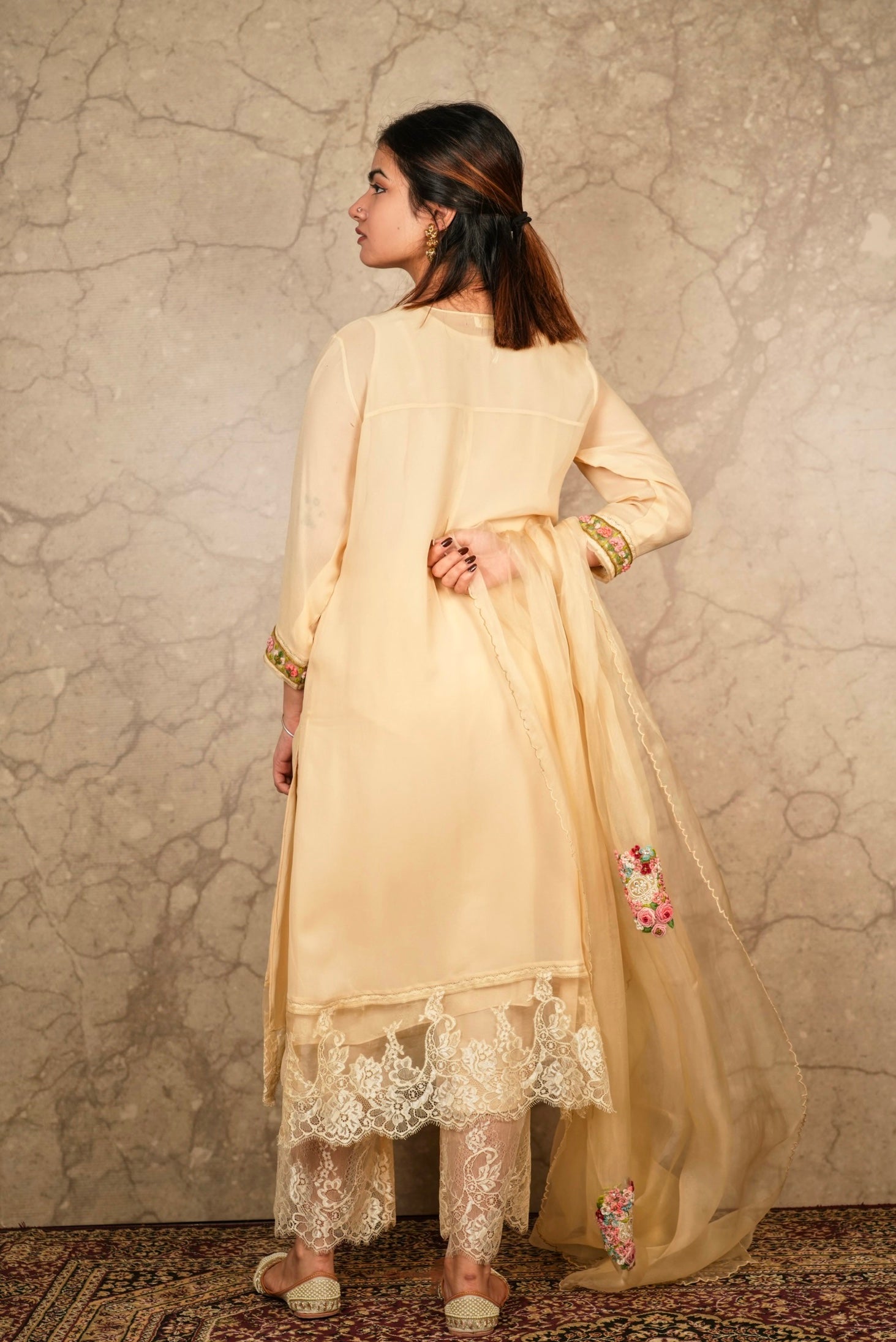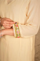 This outfit is crafted from pure fabric. To maintain its quality, colour, and finish, dry clean only is recommended