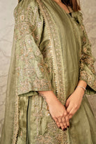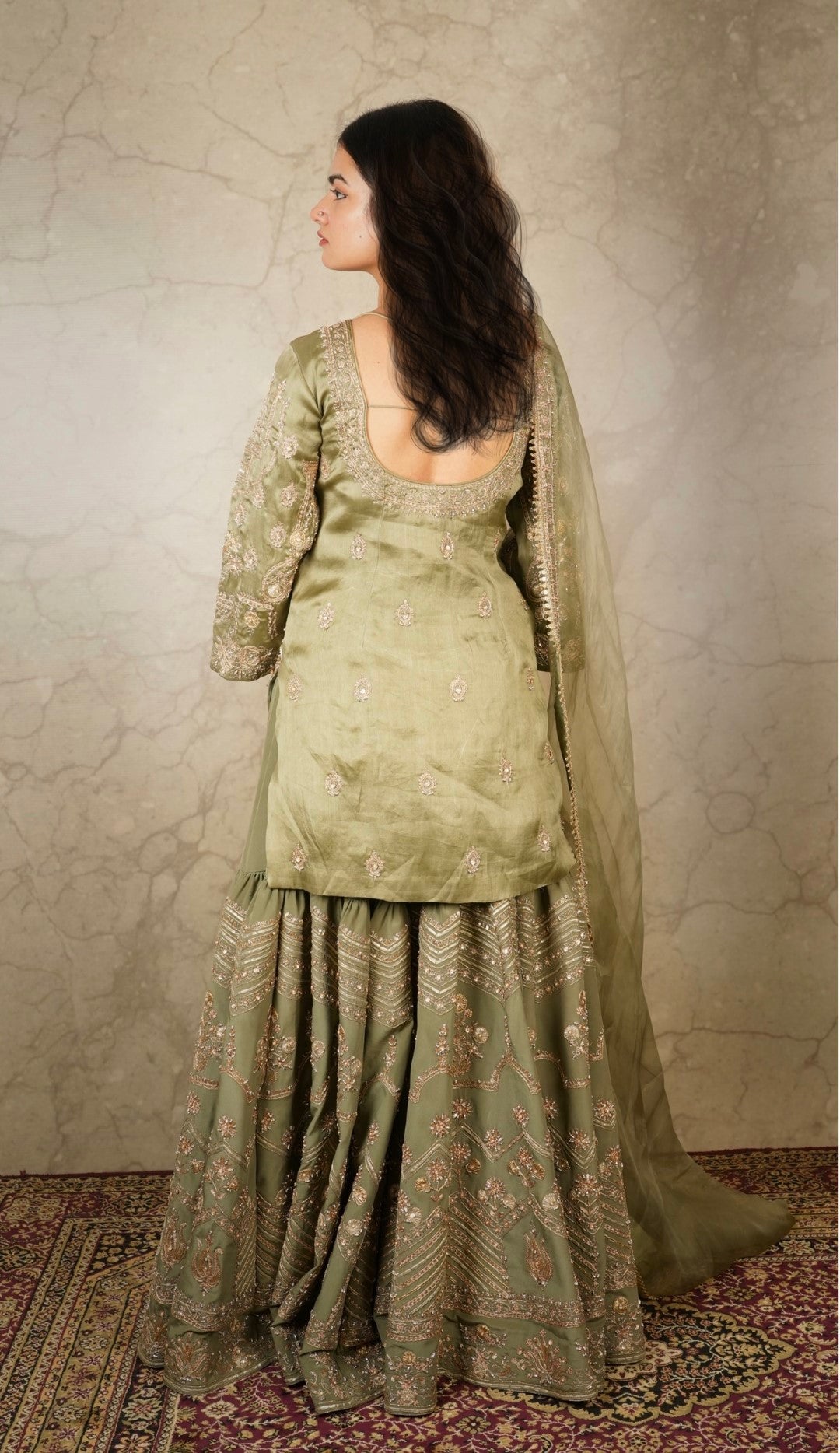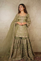 A green gharara outfit features a short kurti and flared pants that fit at the thighs and widen from the knees. Made from satin organza shirt and crape gharara fabrics, it's adorned with intricate hand embroidery on shirt and gharara. The vibrant green color adds freshness and vibrancy. Paired with a organza dupatta, it exudes elegance. Perfect for weddings and festive occasions, it showcases grace and cultural charm.
