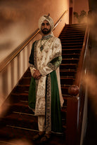 "An ivory baagh achkan lavishly adorned with intricate embroidery, complemented by a luxurious velvet palla, epitomising timeless opulence and regal sophistication.
