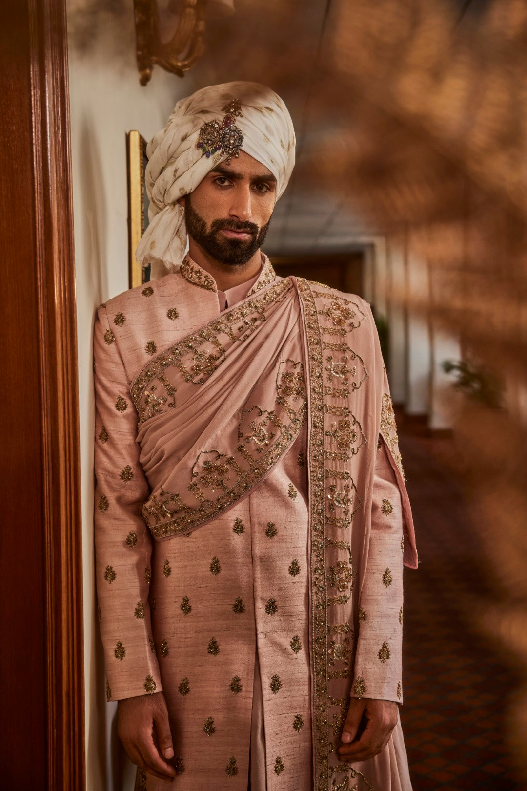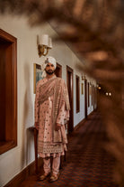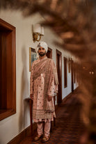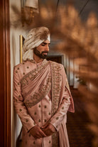 A charming pink achkan beautifully adorned with intricate embroidery, paired with a graceful crepe palla, combining traditional elegance with a contemporary touch.