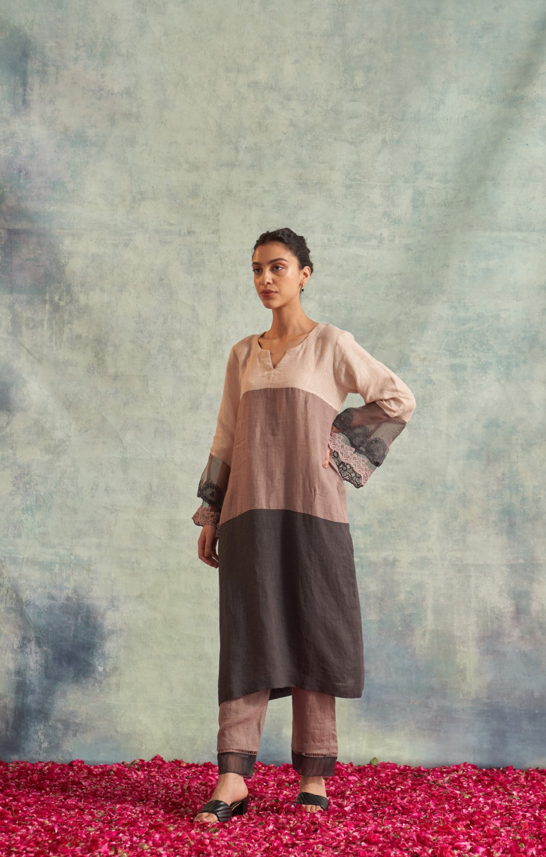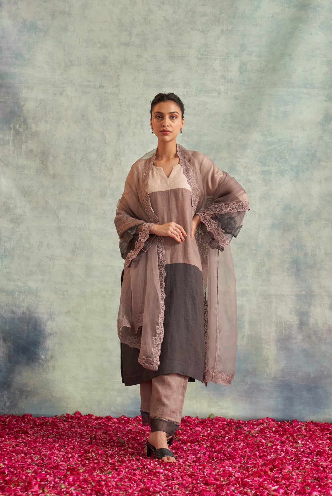Contains 3 pieces - Linen shirt, linen pants & organza dupatta