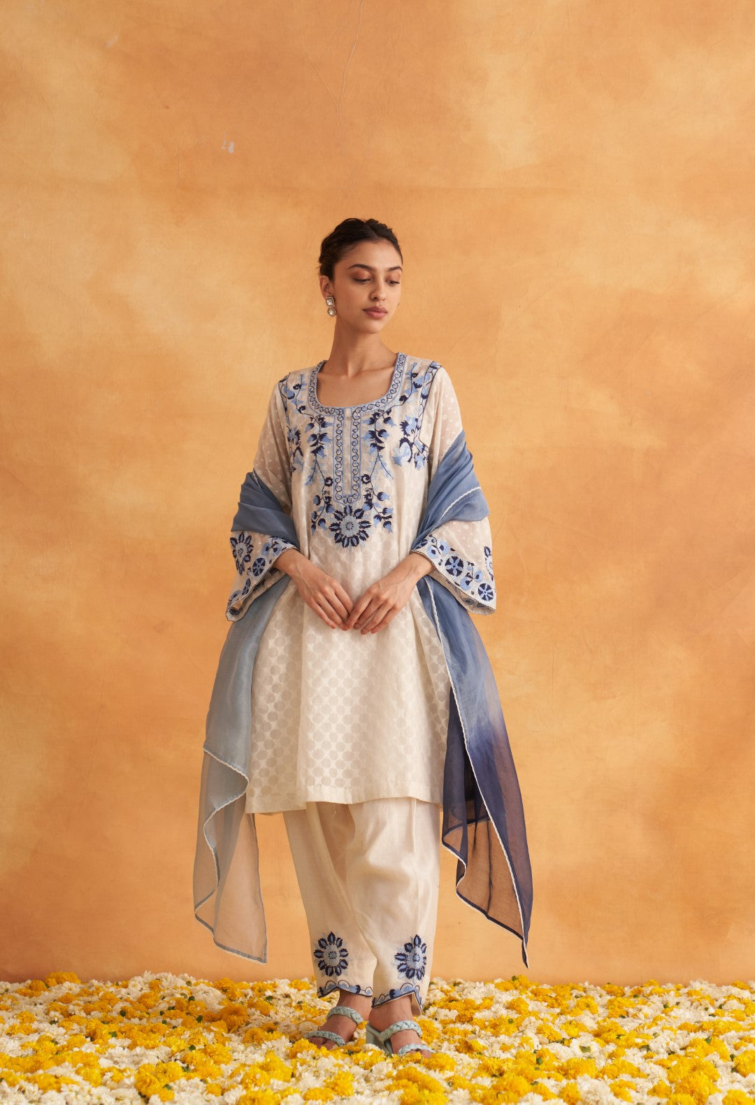 Contains 4 pieces - Chanderi shirt, cotton undershirt, Chanderi salwar with cotton lining & net dupatta