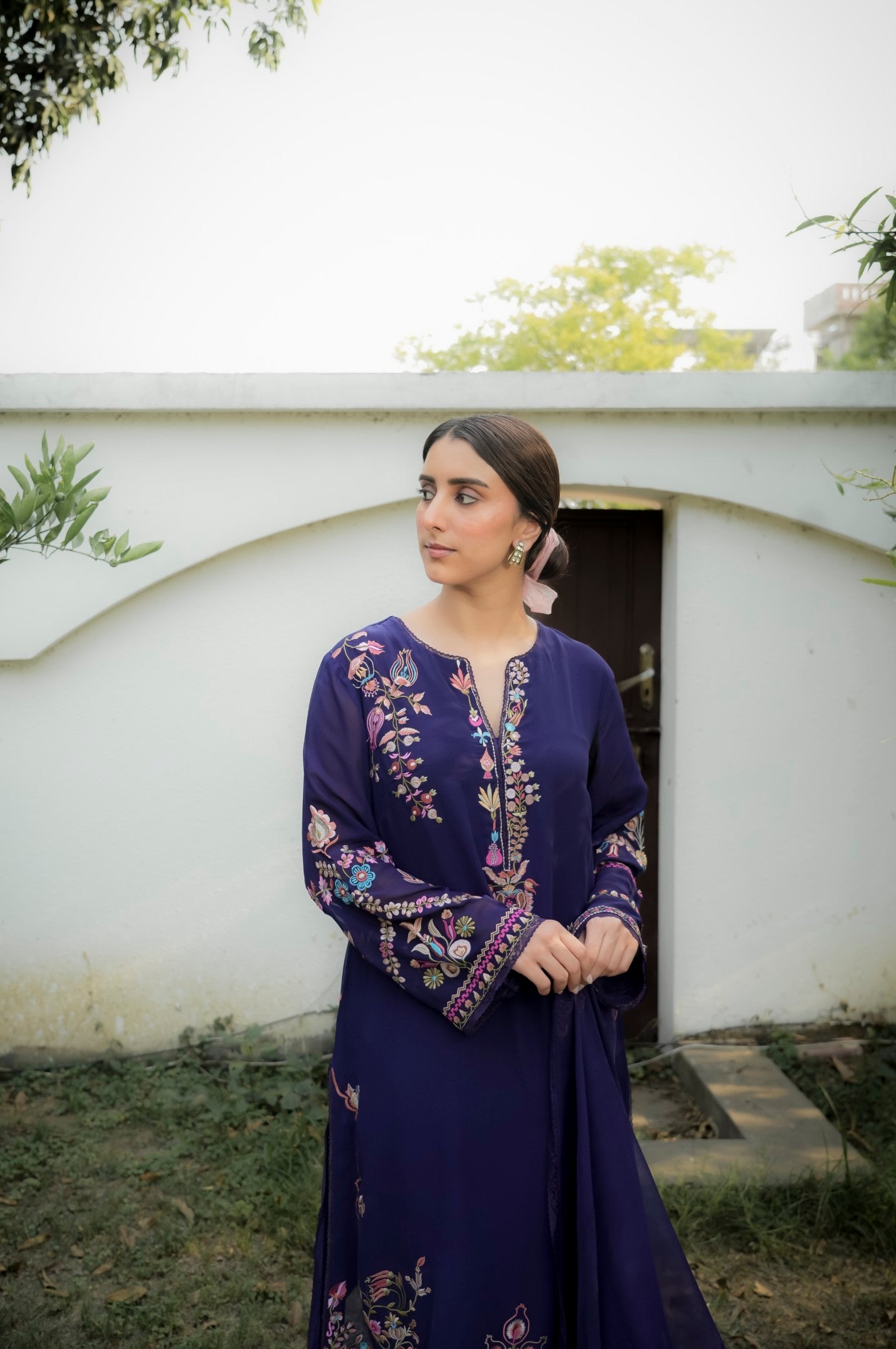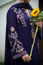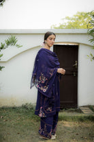 Bold, elegant, and timeless this midnight blue georgette suit features rich multicolour thread embroidery, crafted in intricate patterns that bring life and vibrancy to the deep, regal base. The heavy threadwork adds texture and opulence, making it a standout piece for festive nights, wedding events, or evening gatherings. A perfect blend of traditional craft and striking colour play.