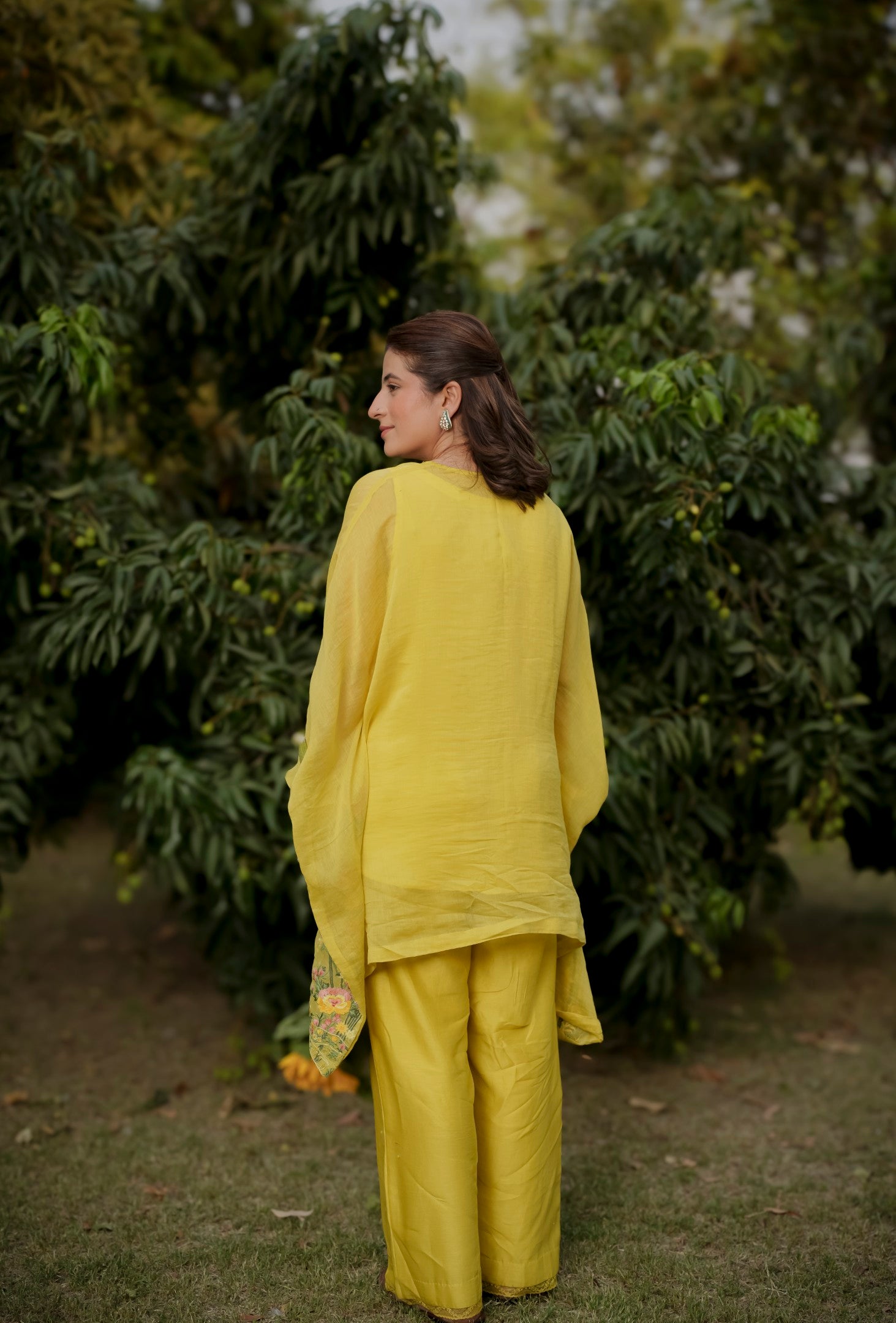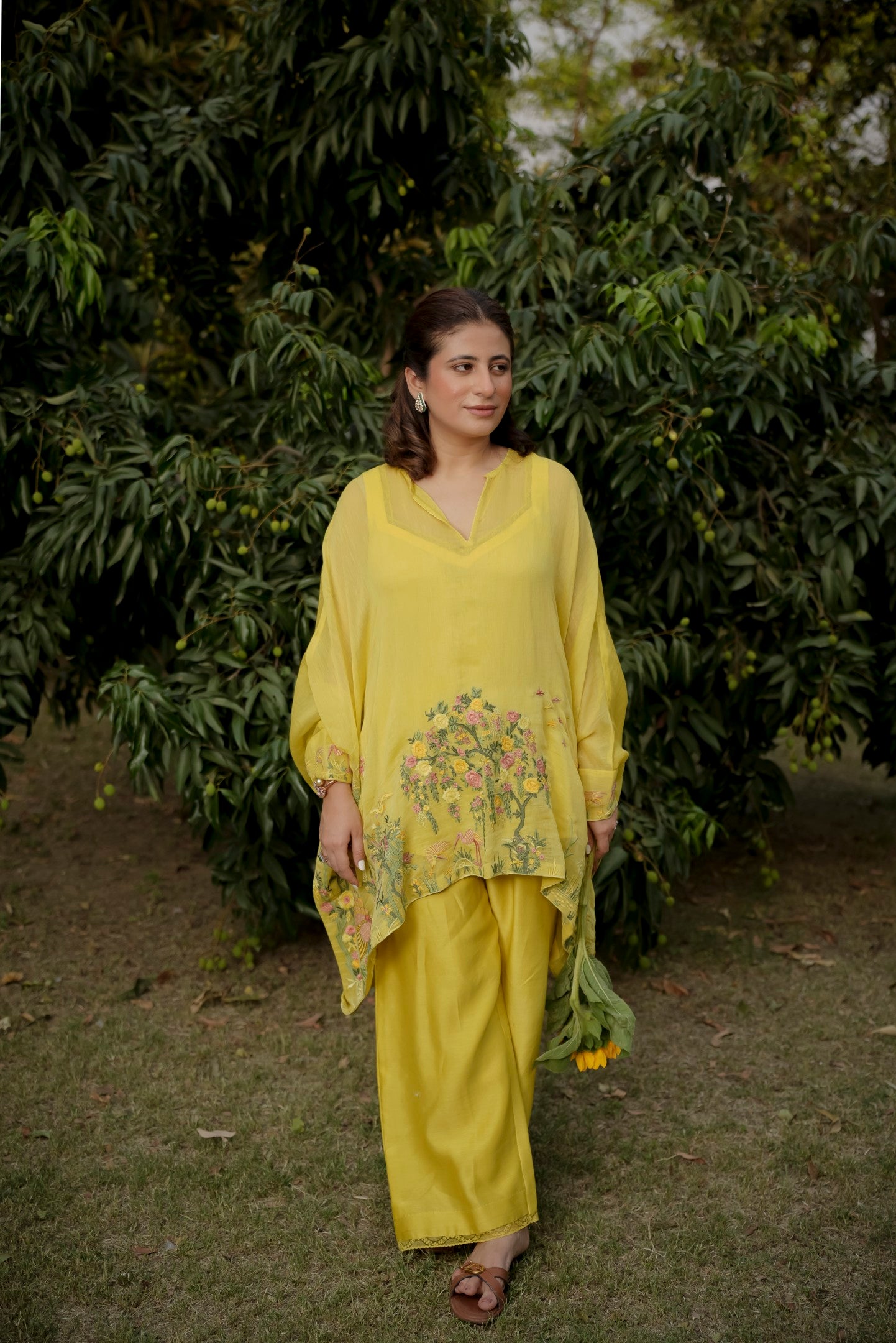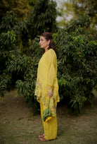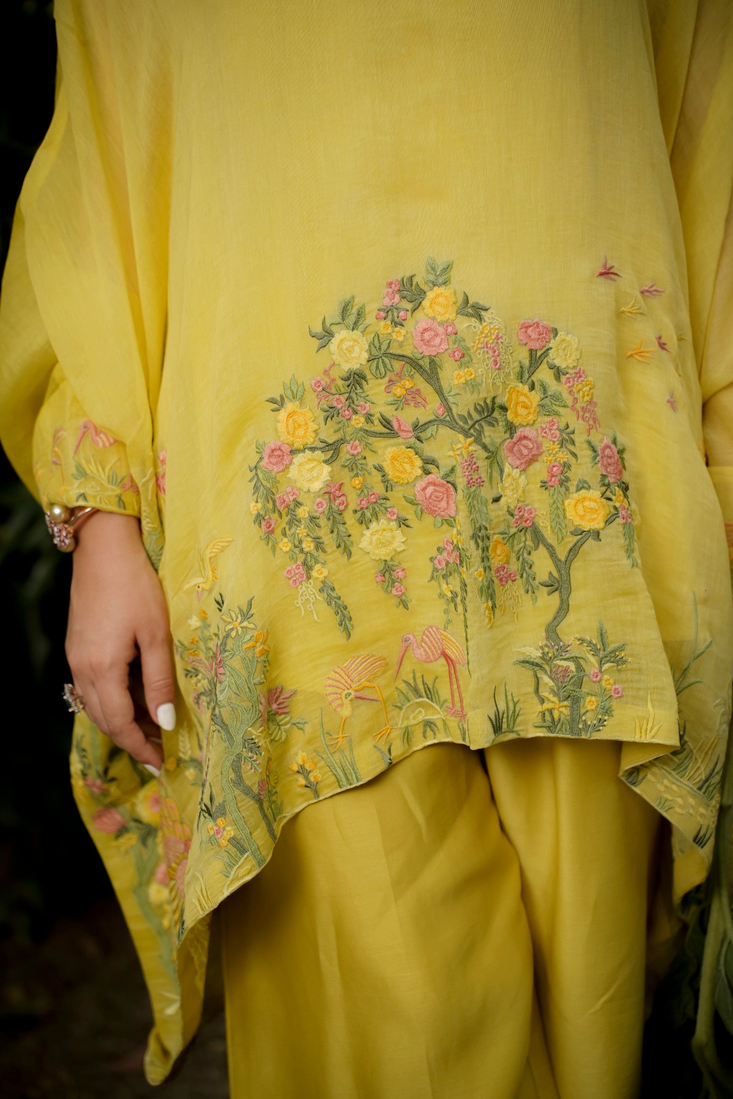 Bright and breezy, this yellow Chanderi kaftan brings effortless elegance to your wardrobe. Crafted from fine Chanderi fabric, it features vibrant floral embroidery along the front ghera, adding a splash of color and charm to its flowy silhouette. Perfect for festive brunches, casual gatherings, or a statement summer look.