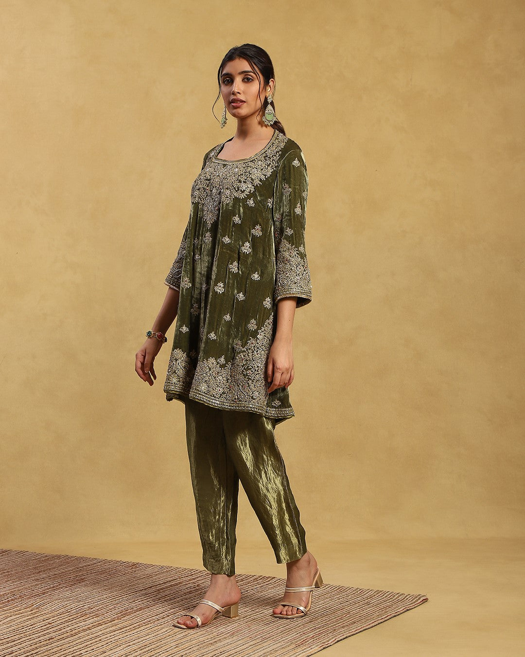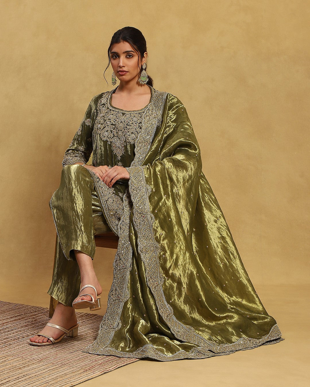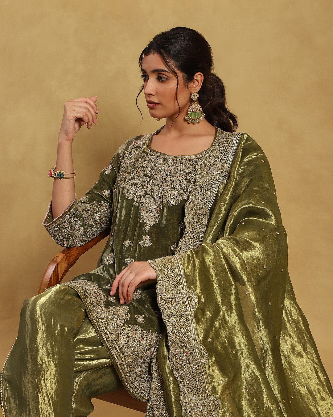 Contains 3 pieces - Pure velvet shirt (art crepe lining), Tissue pants (art crepe lining) & Organza dupatta