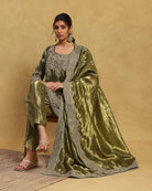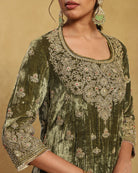 A velvet suit adorned with elegant embroidery, paired with a graceful organza and tissue-lined dupatta, exuding a harmonious blend of luxury and finesse.