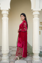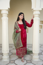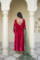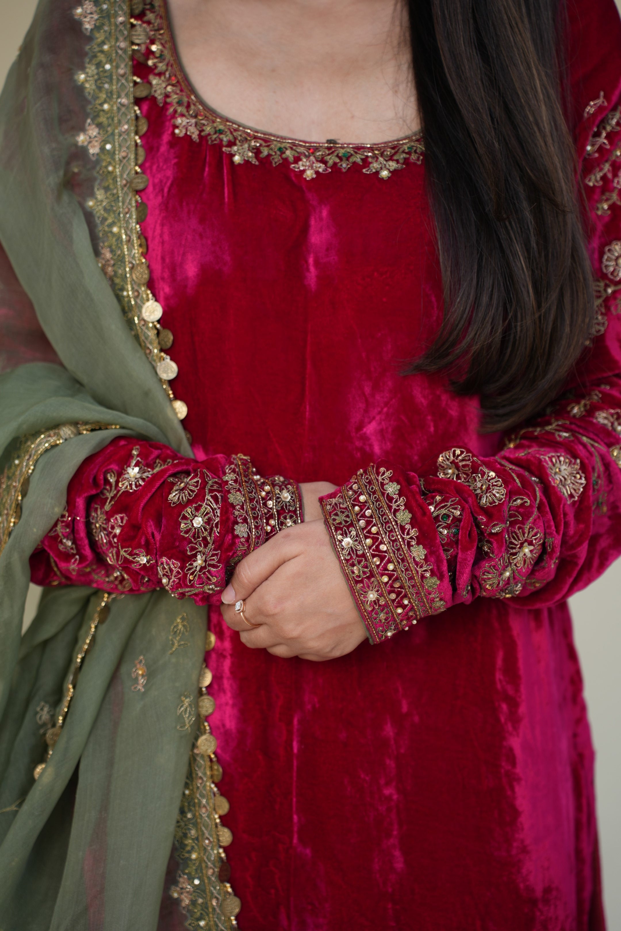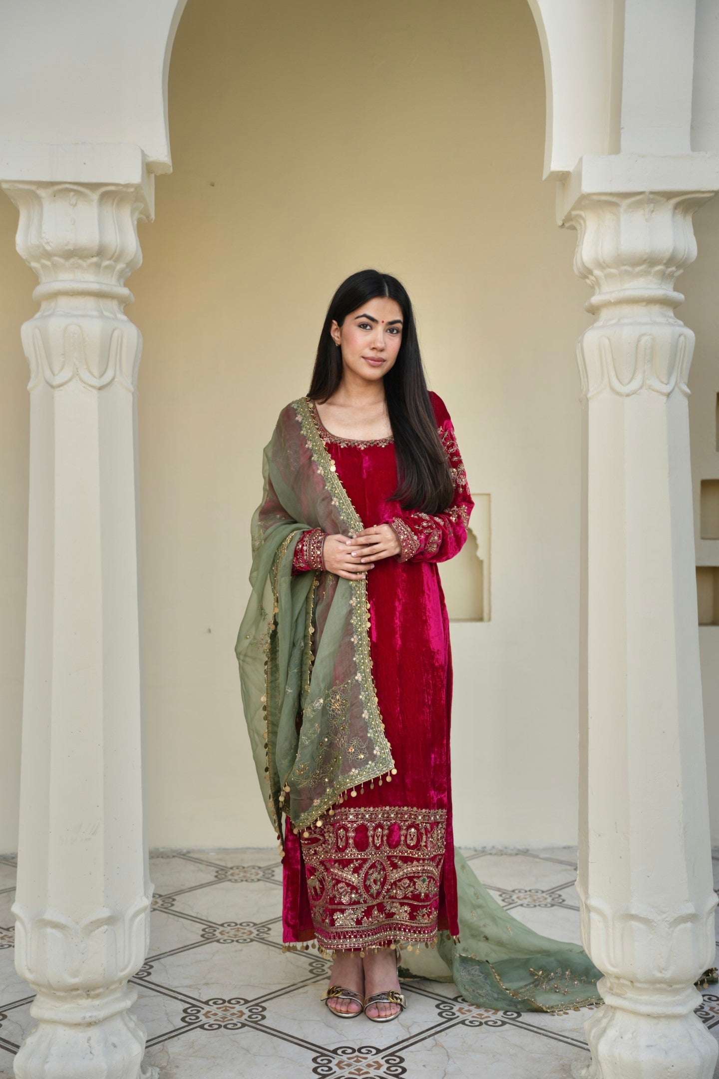 Soft, luxurious velvet fabric ensures a refined look, while the overall ensemble creates a striking contrast between elegance and spiritual energy. Paired with a matching green organza dupatta with subtle embellishments, making it epitome of elegance and refinement. The suit is paired with churidar making it perfect attire for cozy winter occasions.