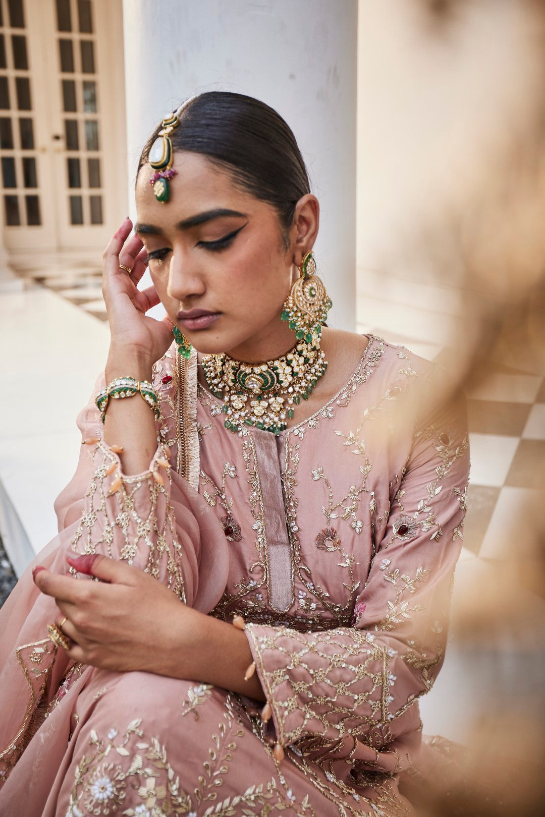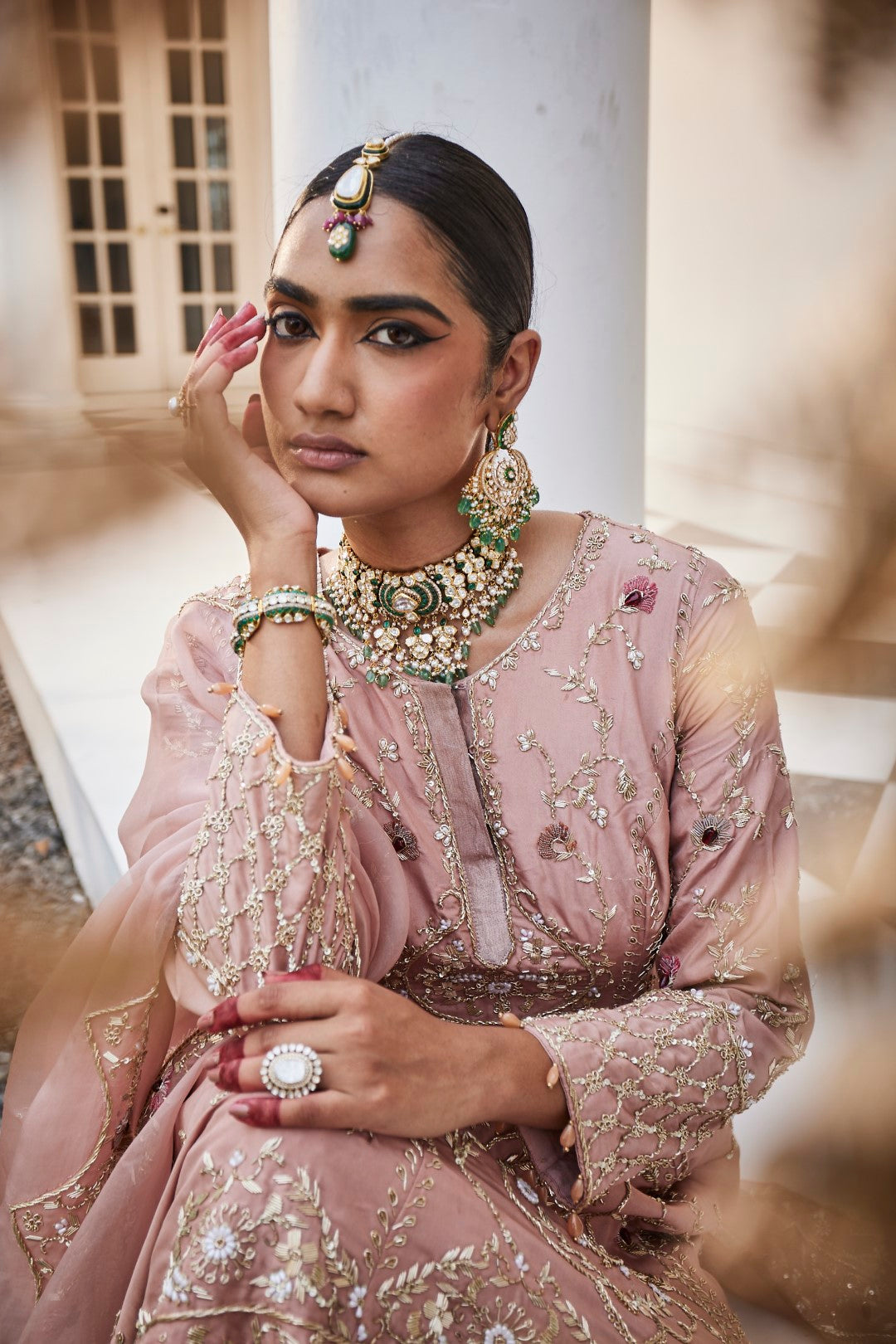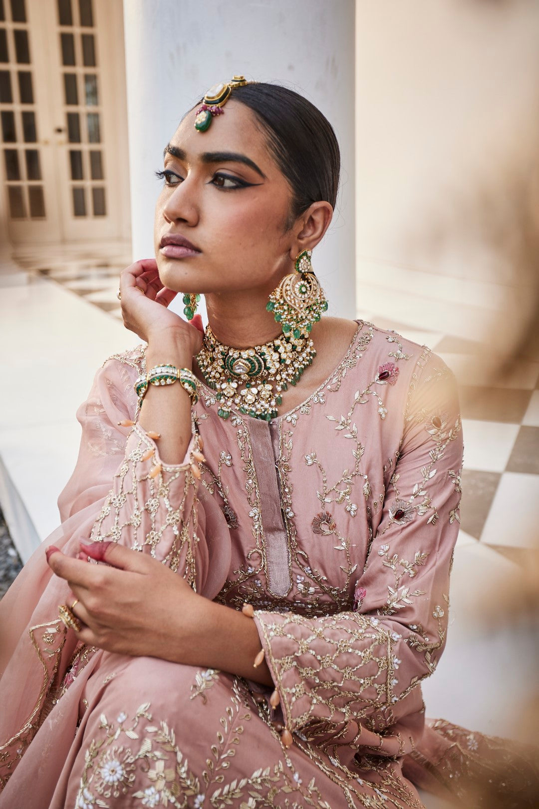 A traditional long shirt suit with delicate hand work with an organza dupatta.
