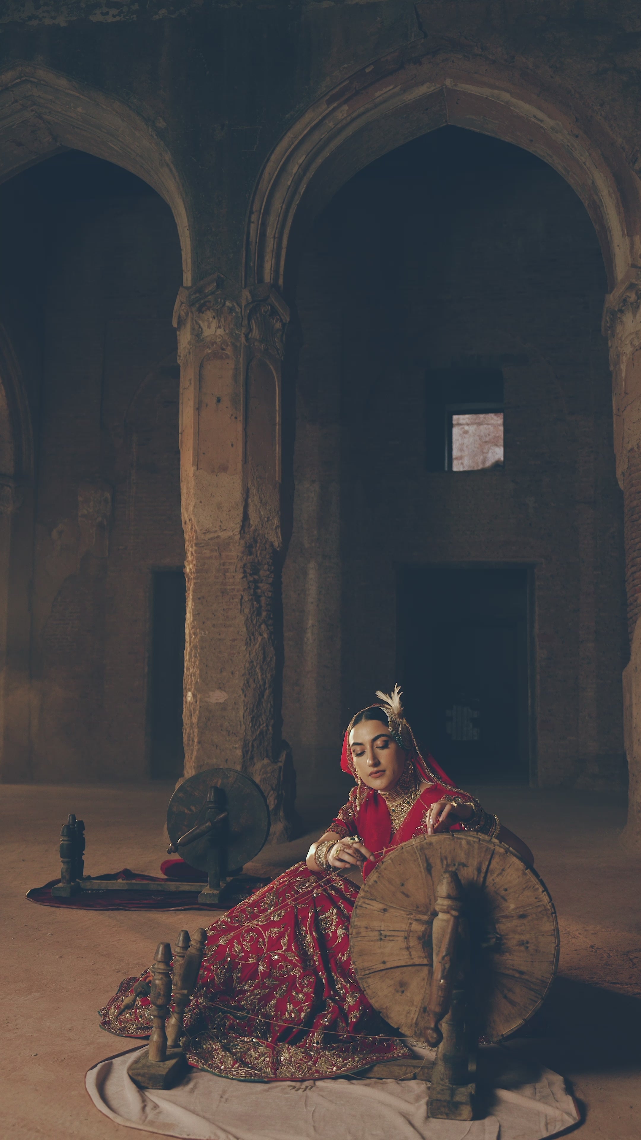 Inspired by the opulence of royal courts, this deep red bridal lehenga is richly adorned with all-over kora embroidery, echoing centuries of ceremonial craftsmanship. The contrast green dupatta adds a regal balance, long associated with prosperity and dynastic pride. Steeped in tradition and authority, this ensemble embodies timeless heritage and royal grace.