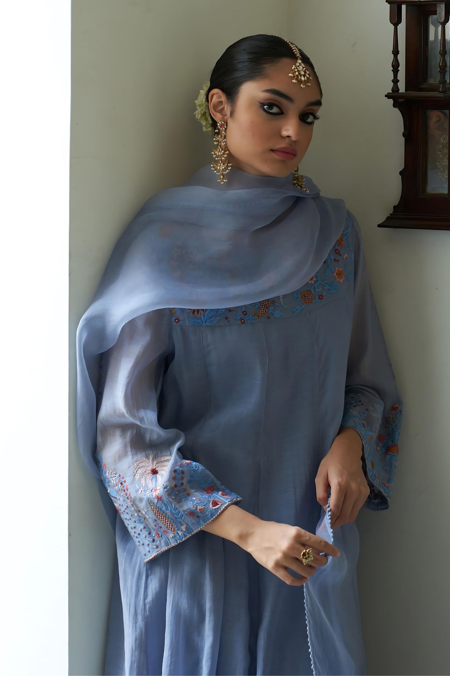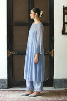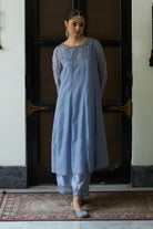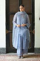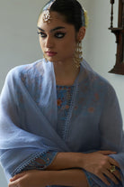 Sculpting an A-shaped silhouette, powder blue chanderi suit, gracefully flared with kalis adorning front and back, Paired with an ethereal organza dupatta, delicately embroidered, a symphony of elegance for a timeless statement.